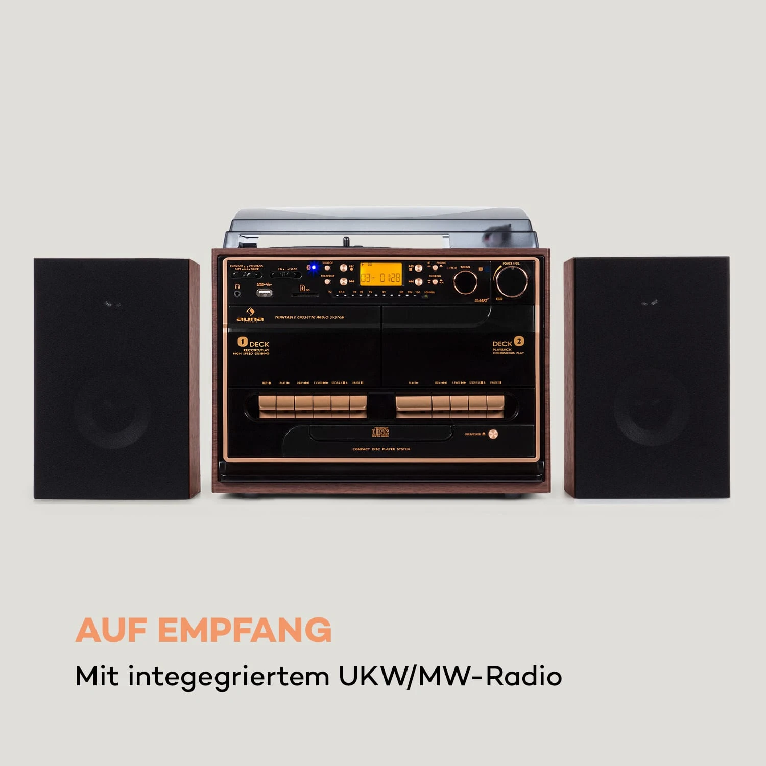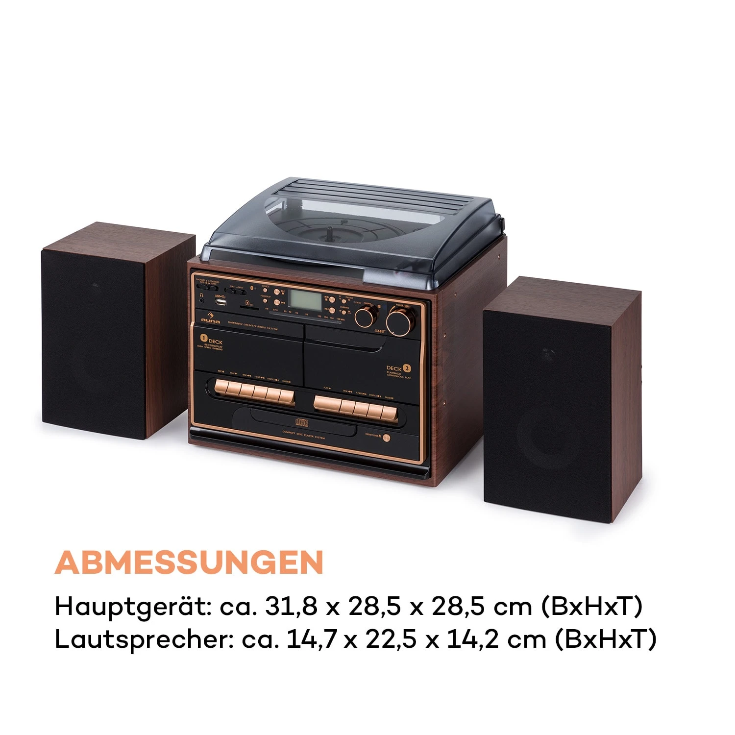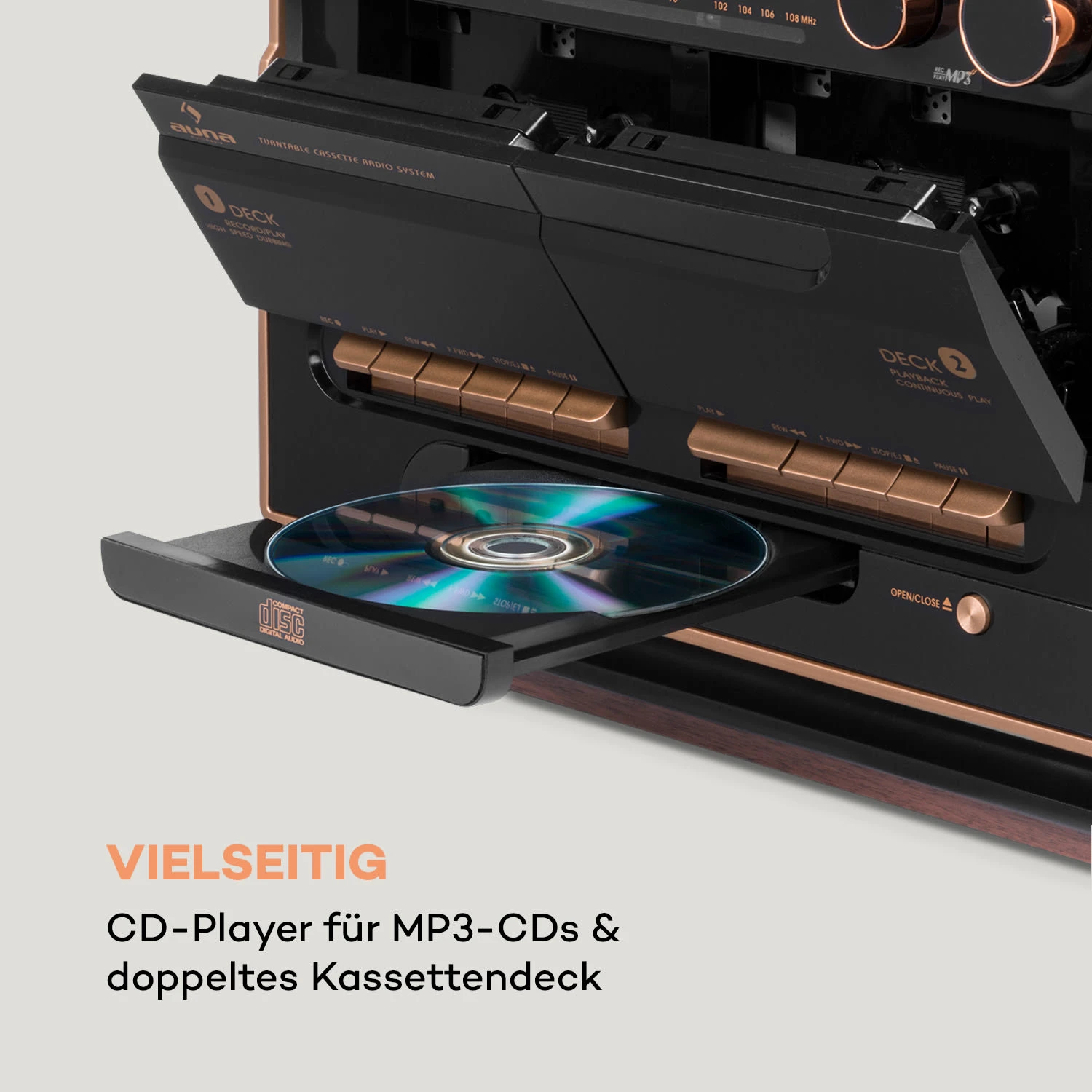 State of the Art verschmilzt mit guter alter Analog-Schule: Das auna 388-BT Wood Hifi System ist klassische Musikanlage und High-Tech-Wiedergabegerät in einem. Ausgestattet mit dem vollen Repertoire an altbewährten Audio-Abspielgeräten, wie Plattenspieler, CD-Player und zwei Kassettendecks für deine ganze Musikbibliothek, weiß die auna Kompaktanlage aber auch mit MP3s professionell umzugehen.