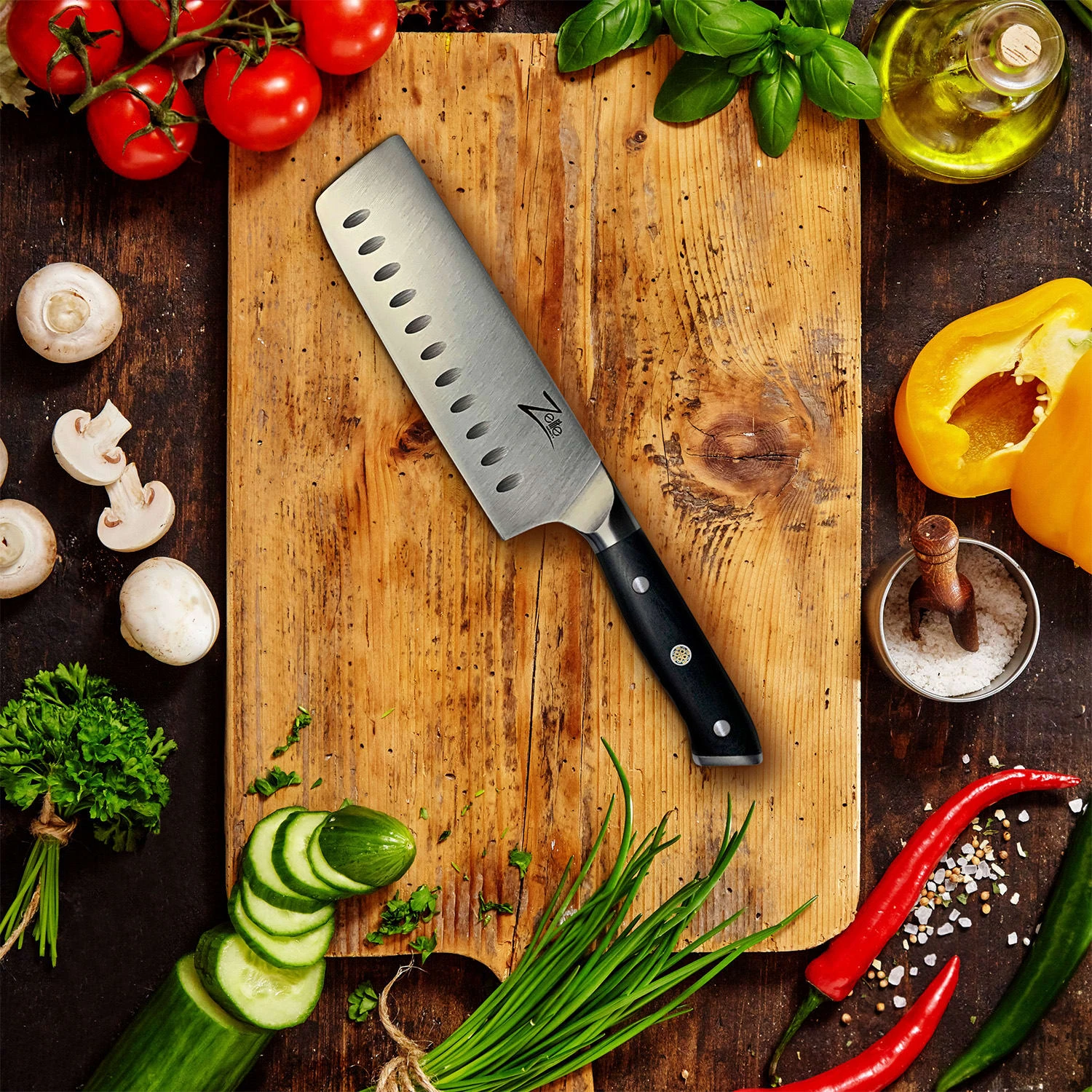 Das 7″ Nakirimesser ist aus deutschem Qualitäts-Edelstahl von Thyssenkrupp und schwarzem Pakkaholz gefertigt. Der ergonomische, dreifach vernietete Griff ist mit einer Mosaikniete versehen und liegt beim Schneiden gut und sicher in der Hand. Die ultrascharfe, dünne, vorn und hinten eckige 7″ Klinge des Gemüsemessers ist ideal zum Hacken, Schneiden und Zerkleinern von Gemüse – ohne Schneide- oder Sägebewegung. Die Vertiefungen auf der Klinge verringern das Anhaften von feuchten Lebensmitteln. Dank ihrer großen Fläche ist sie auch perfekt für die Aufnahme des Schnittguts geeignet. Zusätzlich ist eine Lederscheide zum Schutz der Klinge im Lieferumfang enthalten.