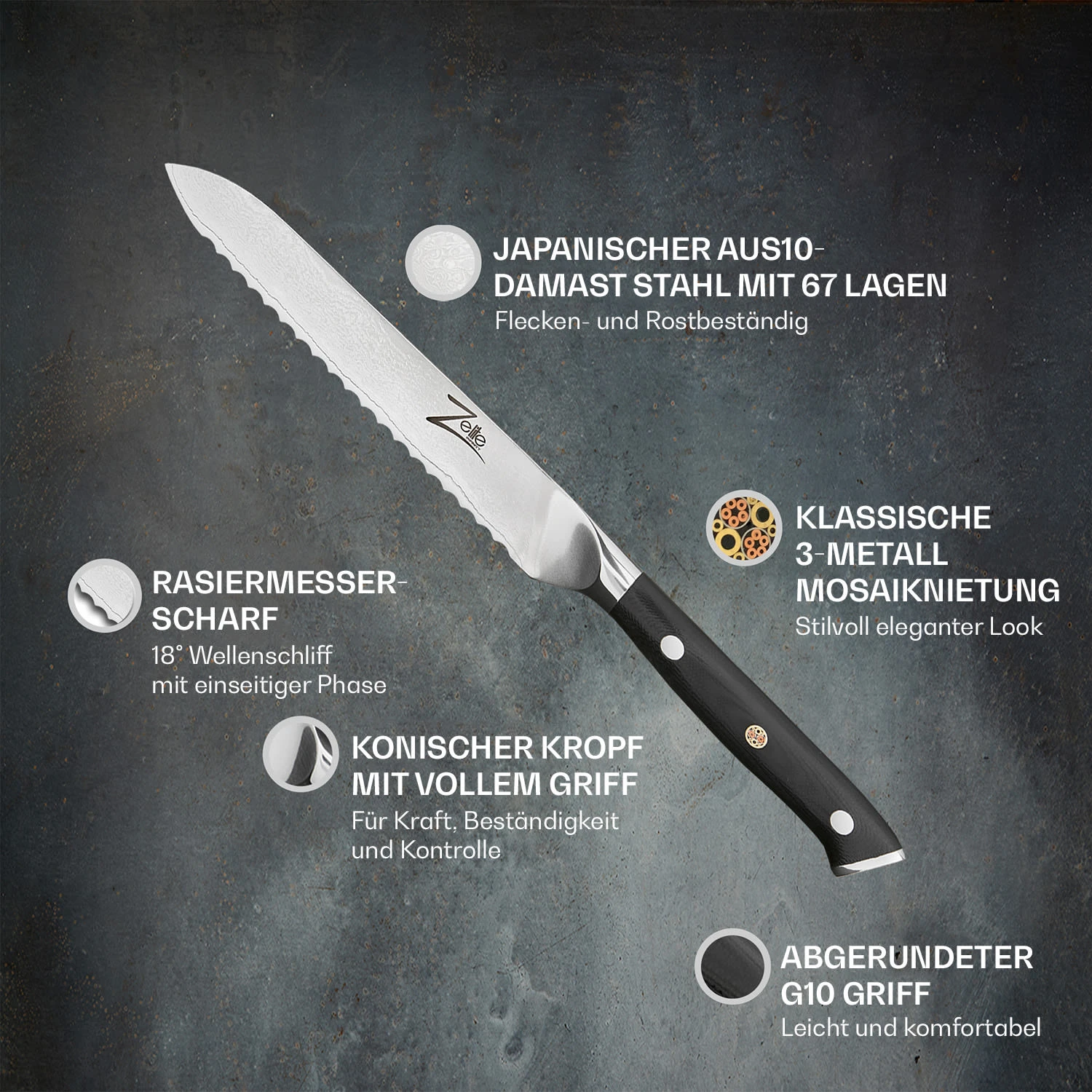 - mit 3-Metall-Mosaikniete in der Klinge