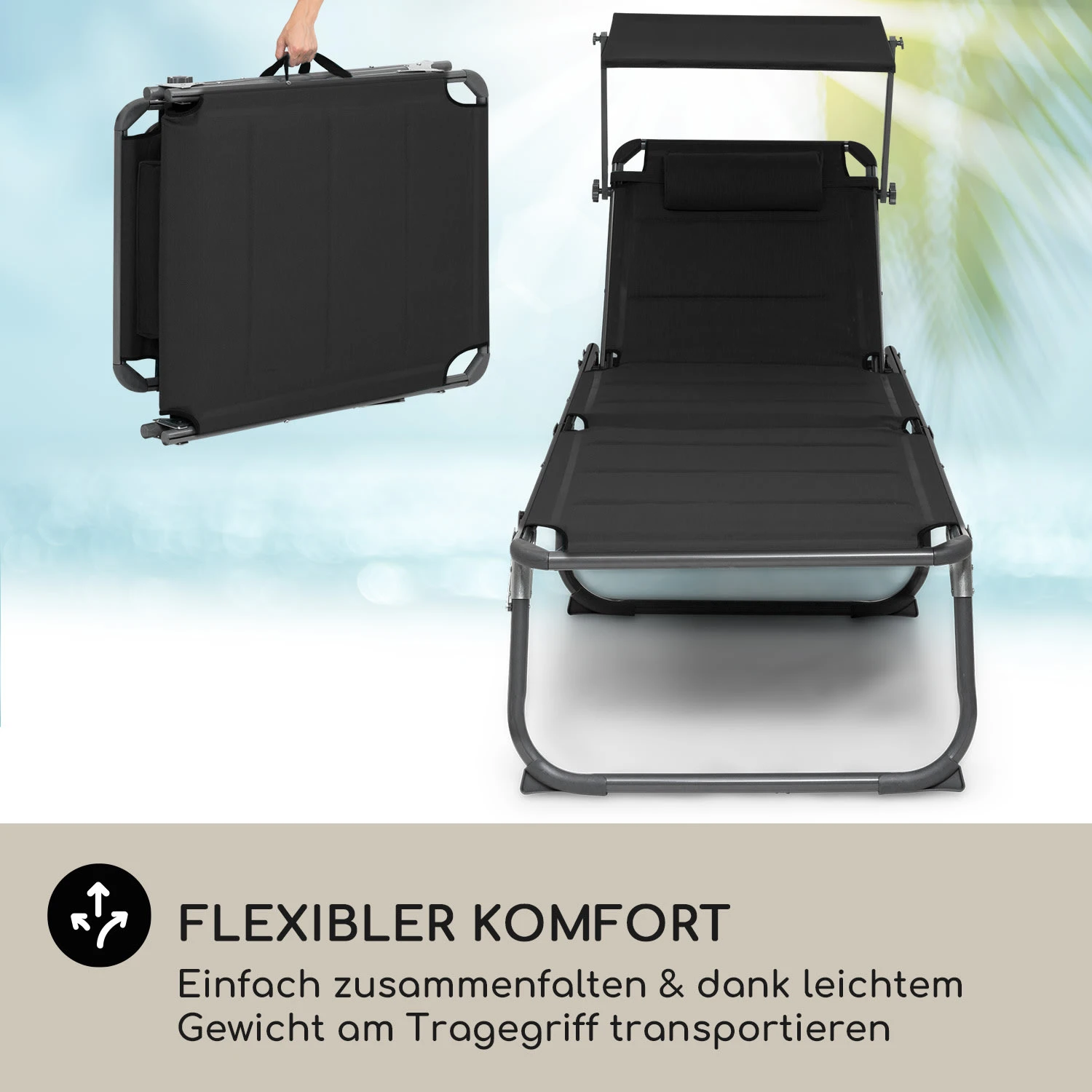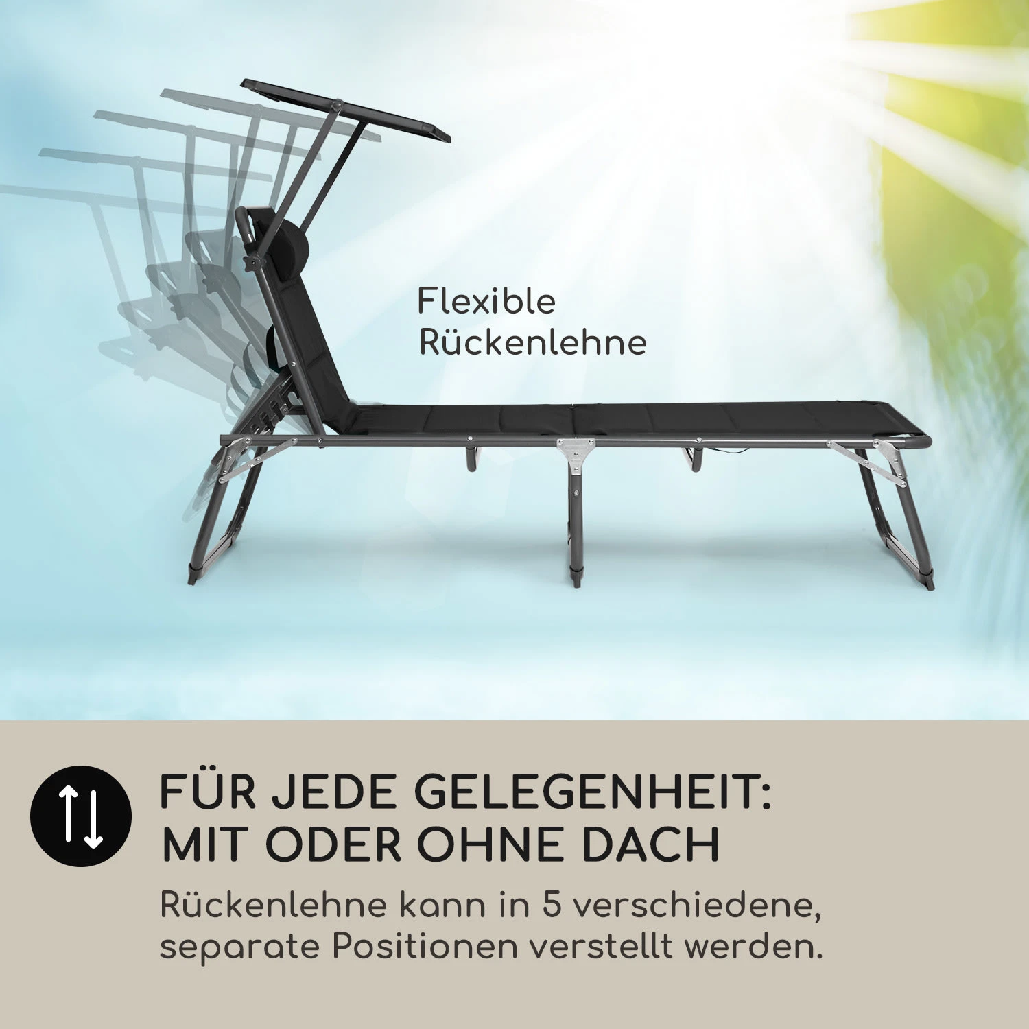 Verschafft dir einen bequemen Platz an der Sonne: Die blumfeldt Amalfi Sonnenliege mit gepolsterter Liegefläche, verstellbarer Sonnenblende und 5-stufiger Rückenlehne.