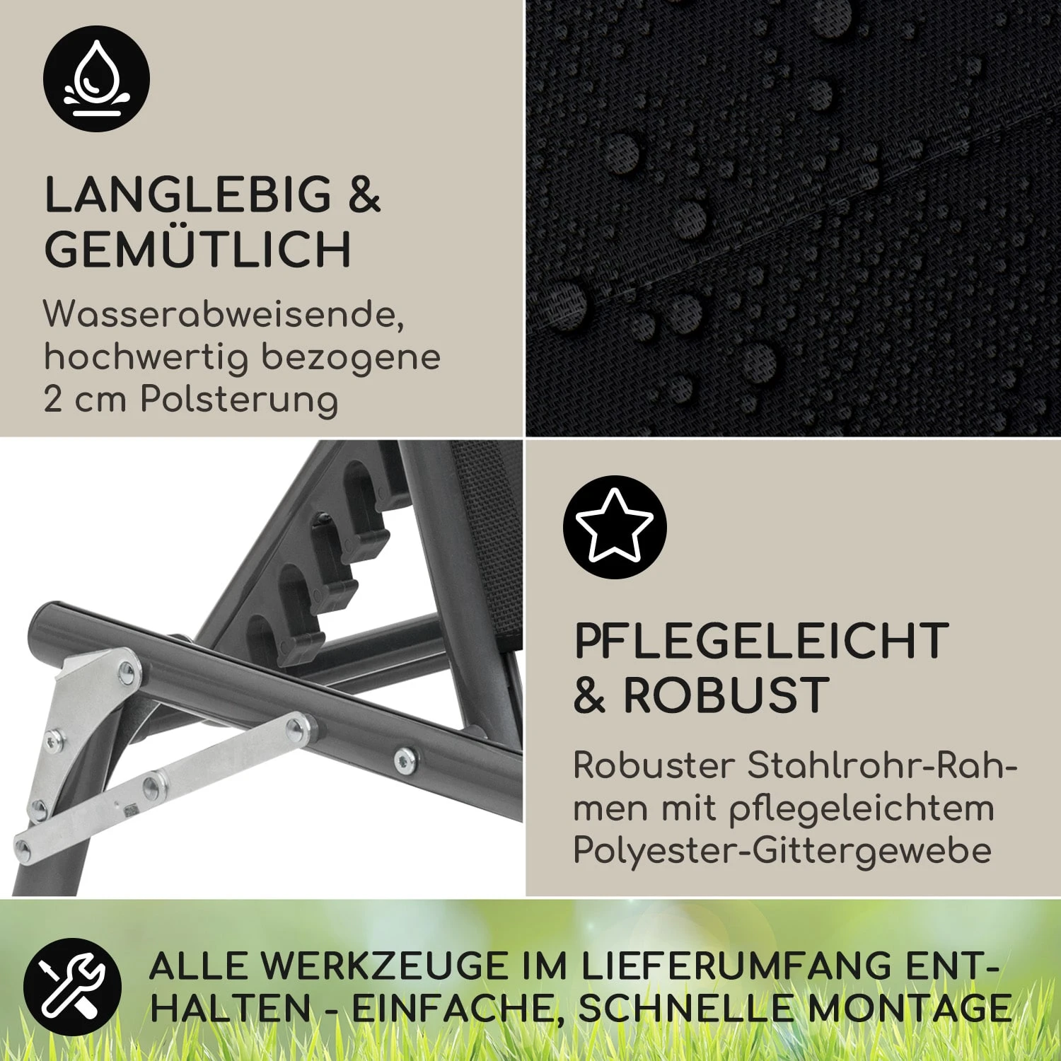- alle Metallteile pulverbeschichtet: kein Rost oder Schimmel