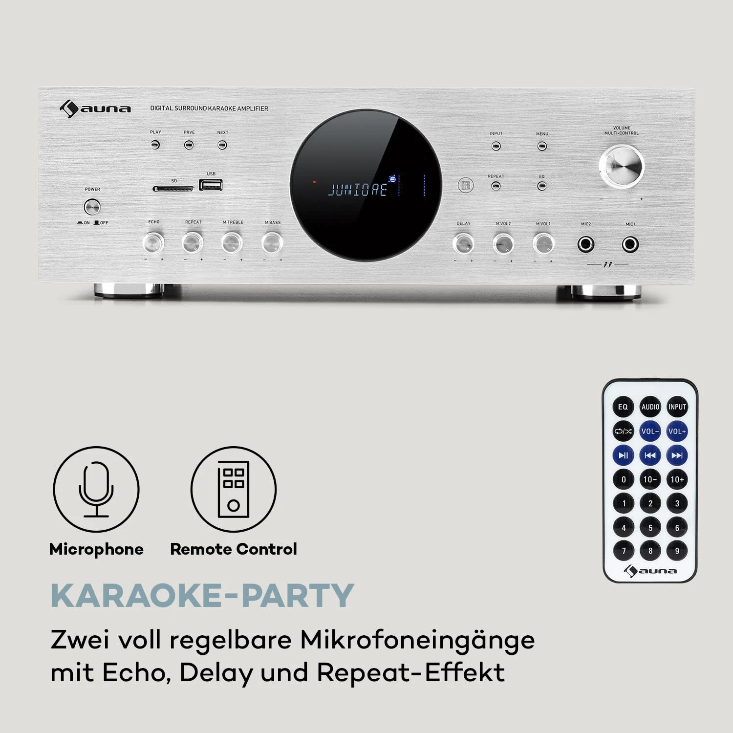Ausgestattet mit einer Bluetooth-Schnittstelle können sämtliche Audio-Dateien innerhalb einer Entfernung von 20 Metern drahtlos und bequem von Smartphone oder Tablet über den auna AMP-218 BT 5.1 Digital-Verstärker abgespielt werden. Zusätzlichen Audio-Input erhält der Verstärker wahlweise über den AUX-Eingang von CD-Player oder Stereoanlage, per DVD-Eingang oder via USB-Port und SD-Slot von Massendatenträgern. Zwei frontseitige Mikrofoneingänge machen den Verstärker zur vollwertigen Karaokemaschine bei der nächsten Heimparty mit Familie und Freunden. Selbstverständlich können die Signale in Lautstärke, Bass und Treble geregelt sowie mit Echo, Repeat und Delay Effekten versehen werden.