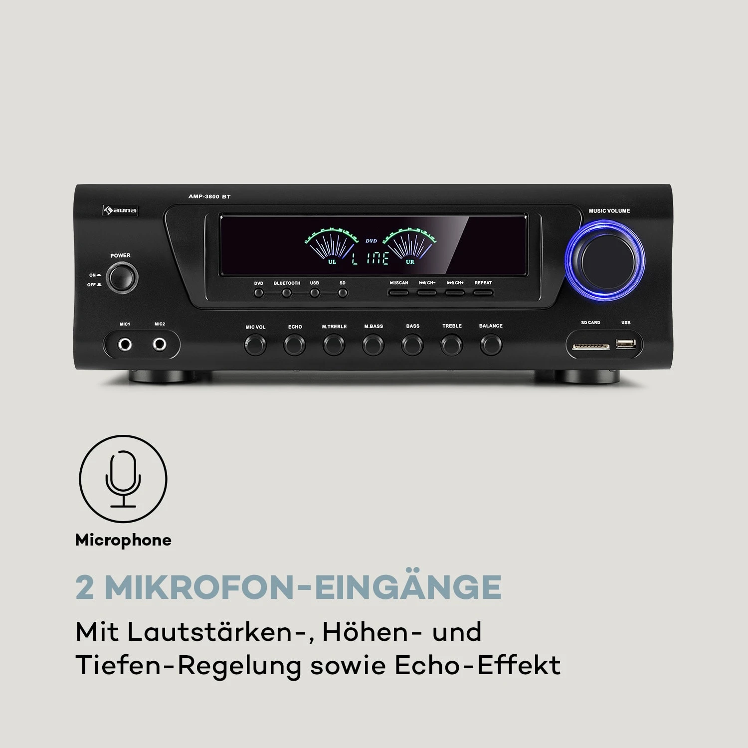 Ausgestattet mit einer Bluetooth-Schnittstelle können über den Stereo-Verstärker sämtliche Audio-Dateien drahtlos und bequem von Smartphone oder Tablet gestreamt werden. Mit einer Ausgangsleistung von 2 x 120 Watt und 3 x 50 Watt RMS und den entsprechenden Anschlüssen an der Rückseite des Geräts wird dein 5.0 Heimkino mit bestem Sound unterstützt. Dabei kannst du Höhen, Tiefen, Balance und Echo-Effekt nach deinen Vorlieben aussteuern. Der auna AMP 3800 BT HiFi-Amplifier verfügt an der Frontseite zudem über einen USB-Port und einen SD-Slot zum einfachen Abspielen von MP3-Dateien sowie zwei Mikrofon-Anschlüsse mit einstellbaren Höhen und Bässen für die nächste Karaoke-Party. Neben den 5 Lautsprecher-Ausgängen findest du auf der Rückseite einen Stereo-DVD-Eingang sowie einen Stereo-Line-Ausgang zur Signalweiterleitung. Die mitgelieferte Fernbedienung erlaubt die bequeme Steuerung aus bis zu 6 m Entfernung.