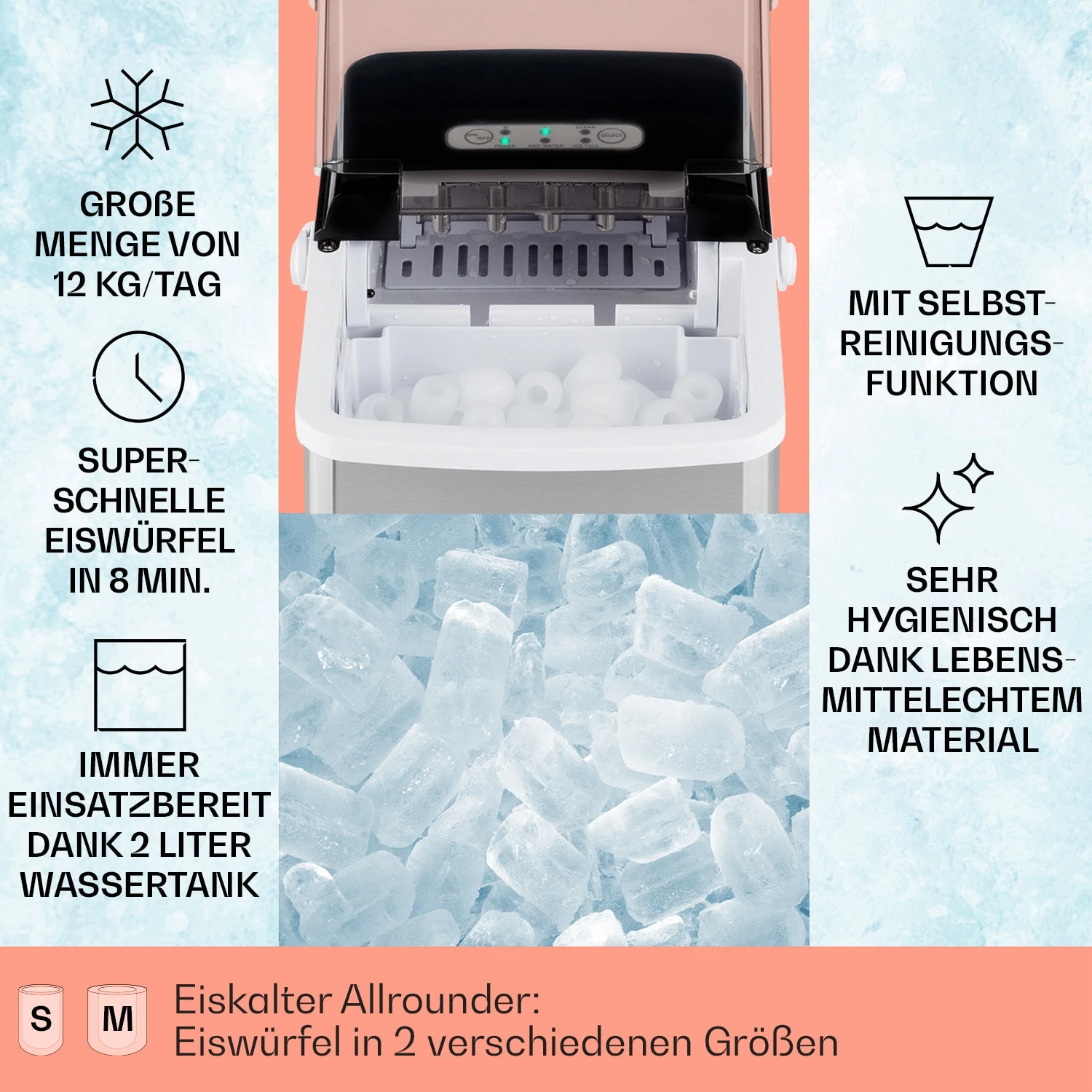 Die leistungsstarke Arctic Porter Eiswürfelmaschine stellt am Tag bis zu 12 kg Bullet-Eis her und ist hervorragend für den Einsatz auf allen Partys sowie in Gaststätten oder Bars geeignet. Auch für den normalen Heimgebrauch ist die Arctic Porter ein echter Gewinn: Mit ihr stehen zuhause immer frische Eiswürfel zum Kühlen von Drinks bereit. Abhängig von der eingestellten Größe S oder L werden 9 Eiswürfel in einem Zyklus von 8 Minuten bereitgestellt. Im Fall eines leeren Wassertanks oder eines vollen Eiswürfelbehälters geben Kontrollleuchten am übersichtlichen Touch-Bedienfeld des Eiswürfelbereiters zuverlässig Auskunft. Und wer gern alles im Blick behält, kann durch das große Sichtfenster den Füllstand genau in Augenschein nehmen, ohne den Kühlbehälter zu öffnen. Besonders praktisch ist der große Tragegriff mit dem sich der Eiswürfelbereiter zum mobilen Erfrischungskünstler verwandelt. Nach Gebrauch lässt sich der Arctic Porter dank Selbstreinigungsfunktion und einem glatten Gehäuse aus Edelstahl leicht reinigen. Das edle Finish fügt sich ideal in jedes Ambiente ein.