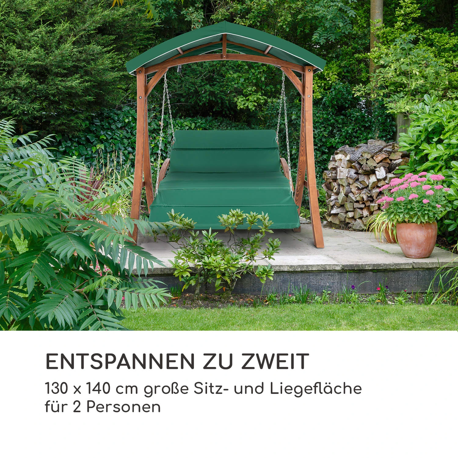 „Stilvoller Komfort und hohe Belastbarkeit: 130 cm breite Sitzfläche mit 4 cm dicken Sitzpolstern und Sonnensegel. Maximale Belastung von 250 kg durch Lärchenholzbalken und rostfreie, vollverzinkte Stahlketten.“