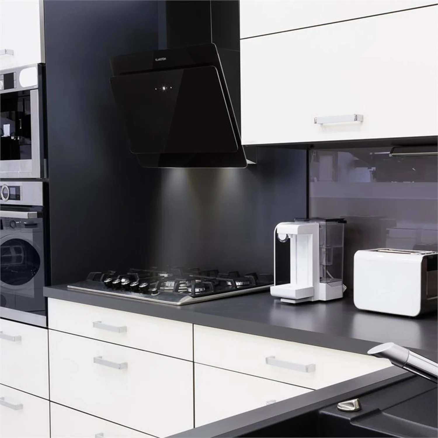 Neben den starken Leistungsdaten überzeugt die Klarstein Aurica 60 Wandabzugshaube als luxuriöser Teil der Kücheneinrichtung: Die schwarze Front mit aufklappbarem Panel aus glänzendem Sicherheitsglas verleiht ihr ein modernes Aussehen, das durch eine 2-teilige, schwarze Kaminverkleidung ergänzt wird. Leistungsstarker, gläserner Luxus für die Küche.