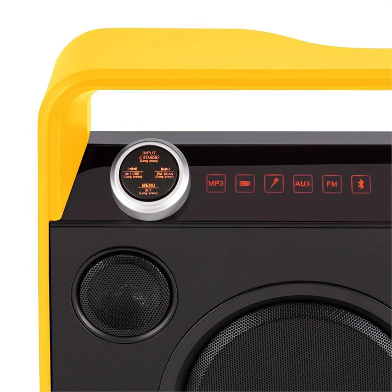 Ein 2-Band Equalizer und der integrierte Digital-Signal-Prozessor bieten dem Nutzer verschiedenste Möglichkeiten den Klang im Bereich der Höhen und Tiefen individuell anzupassen. Vollblutentertainer finden mit den zwei Mikrofoneingängen die passende Schnittstelle um ihrer Stimme Gehör zu verschaffen oder Karaoke-Sängerwettstreite durchzuführen. Dabei lässt sich die Mikrofonlautstärke separat regeln und auf Wunsch sogar mit einem Echo-Effekt versehen. Sämtliche Funktionen können ganz bequem per Fernsteuerung bedient werden. Zwei große Regler an der Boombox selbst ermöglichen auch hier die einfache Bedienung. Ein integriertes LED-Display lässt stets übersichtlich erkennen, welche Funktionen gerade aktiviert wurden.