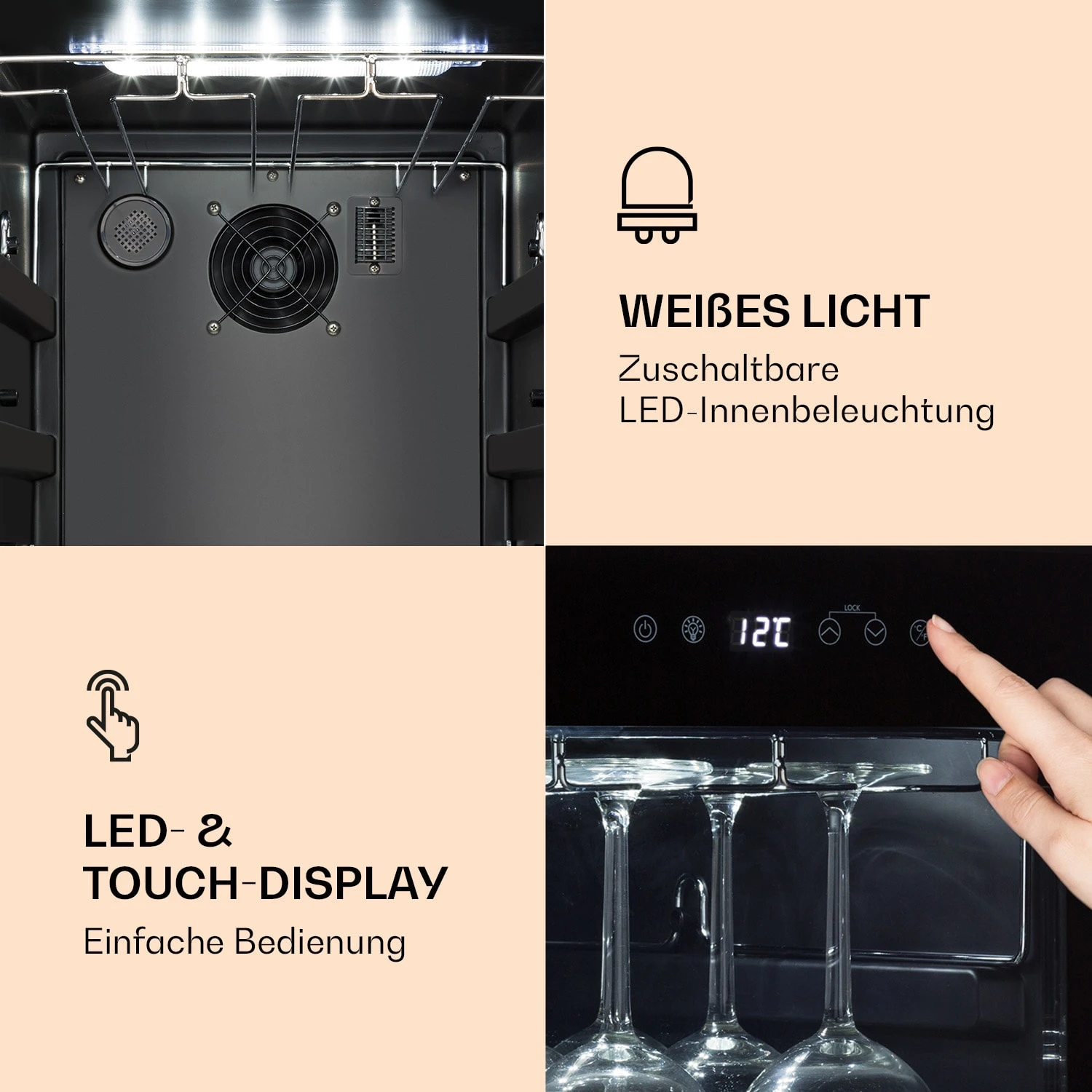 Der Klarstein Bellevin 62 Kühlschrank bietet mit einem Volumen von 173 Litern bis zu 56 Flaschen Wein Platz. Auf 10 Metalleinschüben ruhen die edlen Tropfen bei passenden Lagerungstemperatur. Über das selbsterklärende Touch-Bedienfeld wird die Temperatur gradgenau zwischen 5 und 20 °C eingestellt und sorgt damit auf einfache Weise für perfekte Kühltemperaturen. Ein integrierter Ventilator sorgt dabei für eine gleichmäßige Kühlung im gesamten Innenraum. Ein weiterer Clou am Klarstein Bellevin 62 Weinkühlschrank ist die ChilledGlass Solution mit dem metallenen Glasträger. Hier hängen bis zu 15 Weingläser sauber aufgereiht direkt im Weinschrank und erhalten unkompliziert die gleiche Kühltemperatur wie der Wein – für perfekt gekühlten Genuss!
