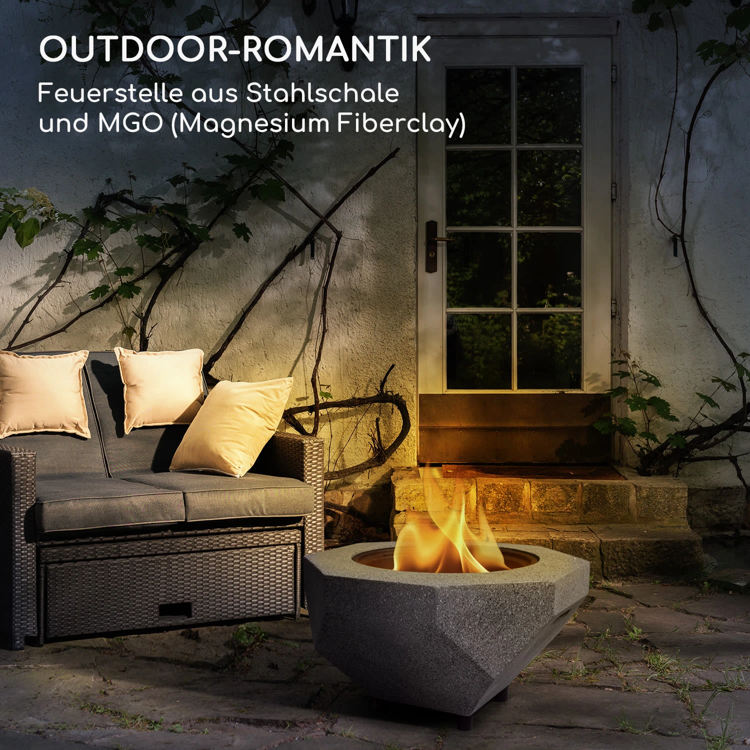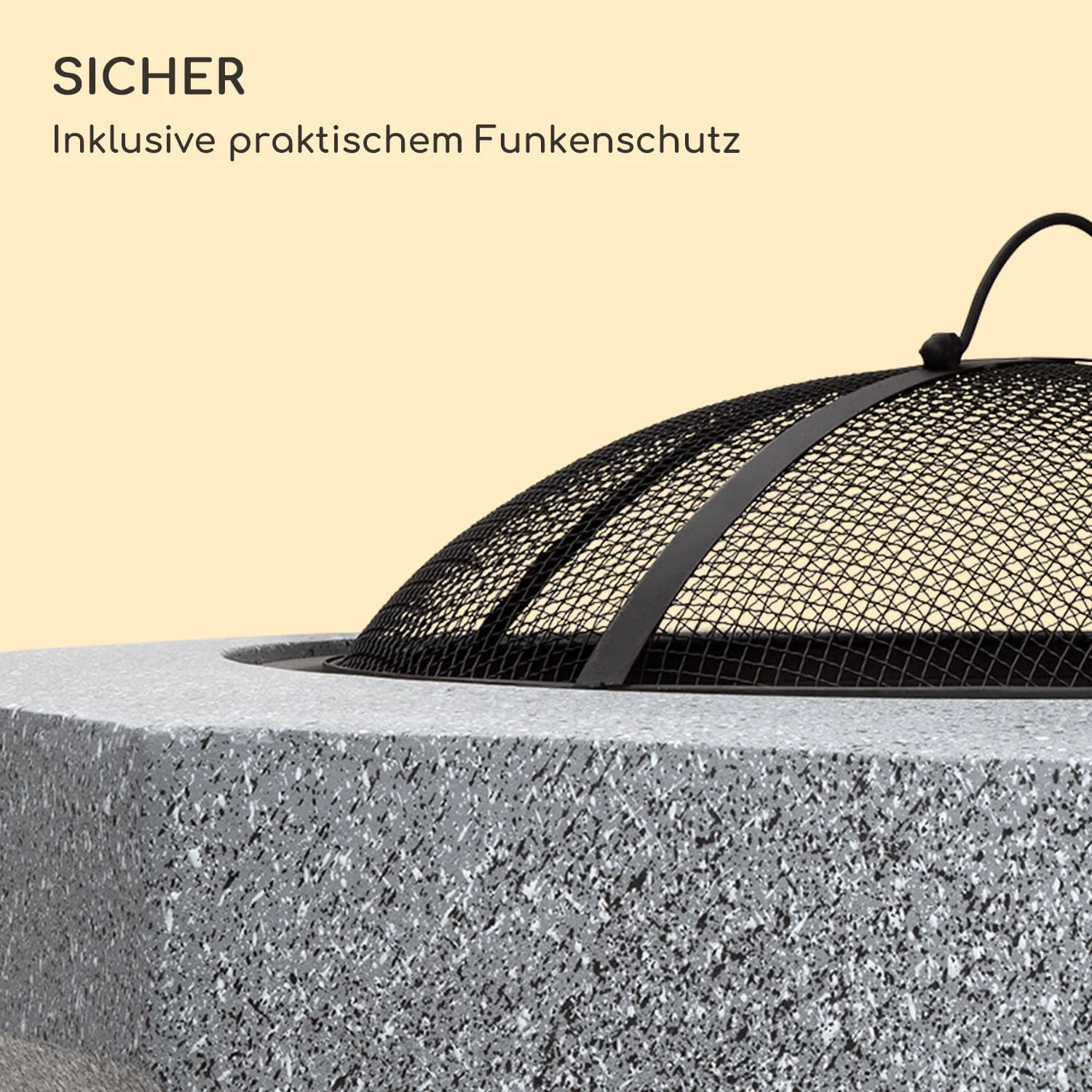 Die ansehnliche Feuerschale ist aus robustem und leichtem MGO (Magnesium Fiberclay) sowie einer hochwertigen Stahlschale gefertigt. Die besondere Formgebung im Edelstein-Design ist ein echter Blickfang und fügt sich ideal in jedes Gartenambiente ein. Durch das Auflegen des Grillrosts aus verchromtem Stahl verlagert sich das Geschehen vom lodernden Flackern zum brutzelnden Gaumenschmaus aus gegrillten Würstchen, Steaks, Gemüsespießen oder auch Grillkäse. Im Lieferumfang enthalten ist zudem ein praktischer Funkenschutz, der alle Umstehenden und die Umgebung vor unkontrolliertem Funkenflug bewahrt. Mithilfe zweier seitlicher Tragegriffe lässt sich die Diamond Feuerschale mit Grill von blumfeldt jederzeit transportieren und versetzen.