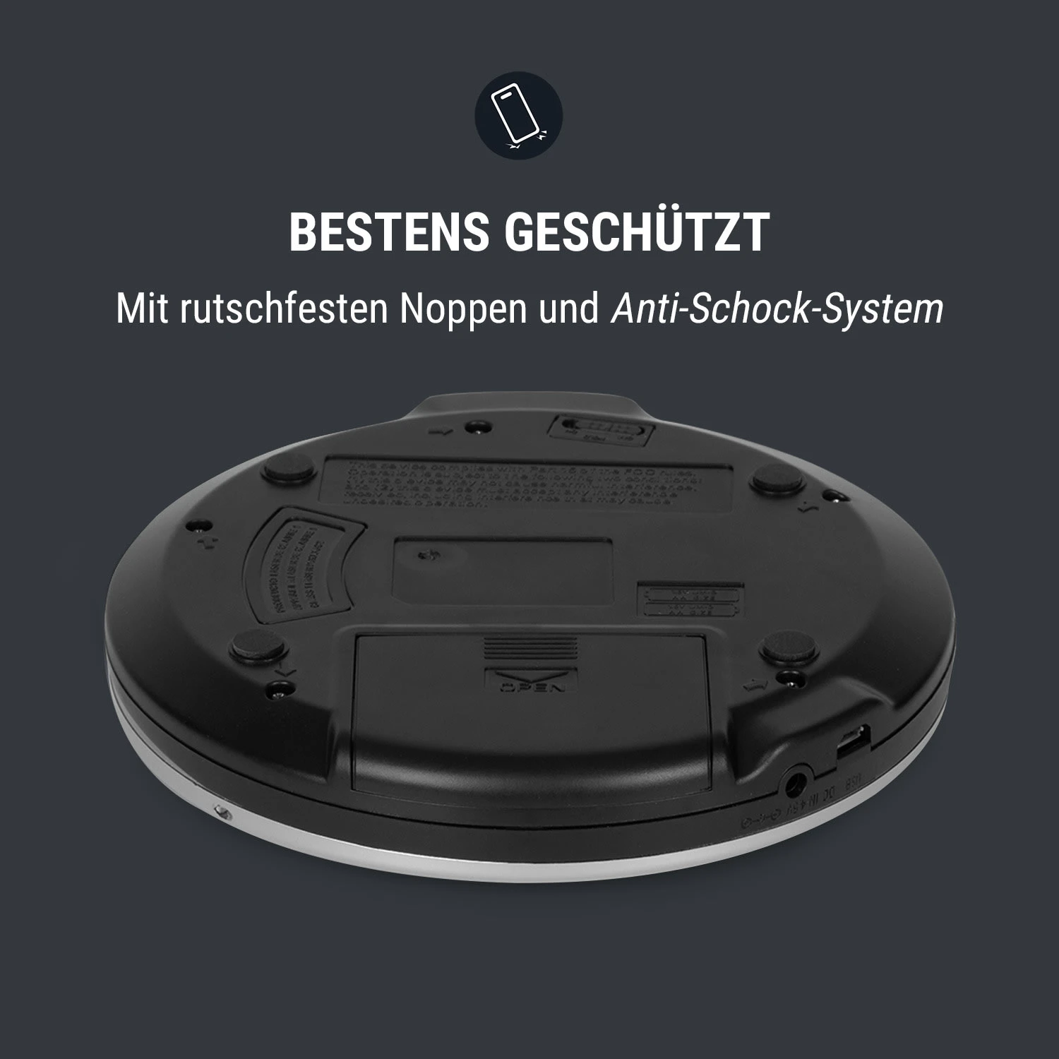 Der CD-Player hat einen Schockschutz, um die Unterbrechung der CD-Wiedergabe bei Erschütterungen zu verhindern. So kann man auch bei holprigen Unternehmungen sicher sein, dass die Musik unterbrechungsfrei weiterläuft. Dem Gerät liegen InEar-Kopfhörer bei, dem Musikgenuss steht also nichts mehr im Wege.