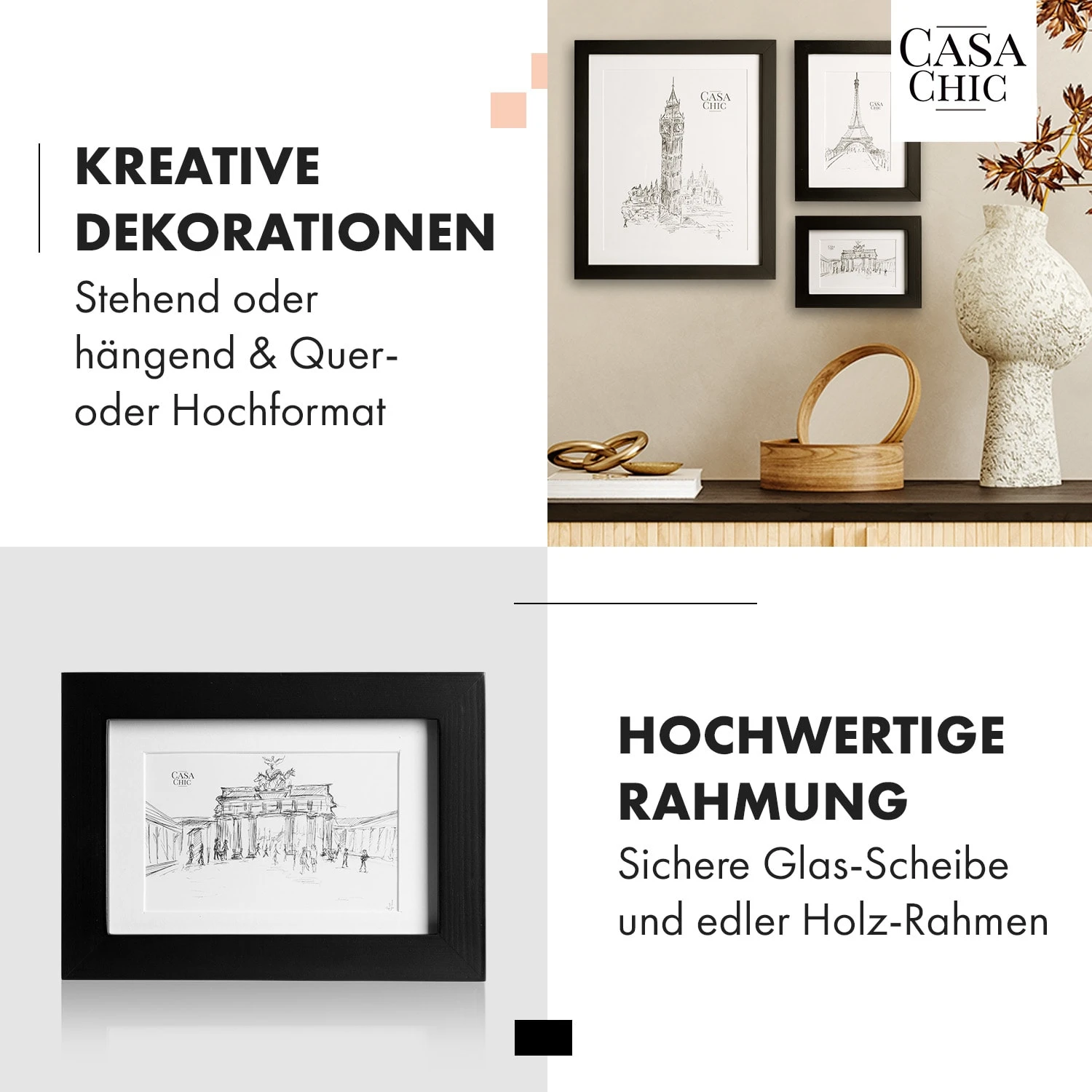 Mit den schlichten Chalcot Echtholz-Bilderrahmen von Casa Chic by blumfeldt kommen deine Fotos und Bilder sowohl im Hoch- als auch im Querformat ideal zur Geltung. Gestalte wunderschöne Wandcollagen, denn der Chalcot kommt direkt als passendes 7er-Set zu dir nach Hause. Die mitgelieferten Passepartouts überlassen dir die Wahl des passenden Bildausschnitts. Sein Rahmenprofil schenkt einen edlen Kontrast und die Frontscheibe aus Echtglas schützt vor Staub und Schmutz.