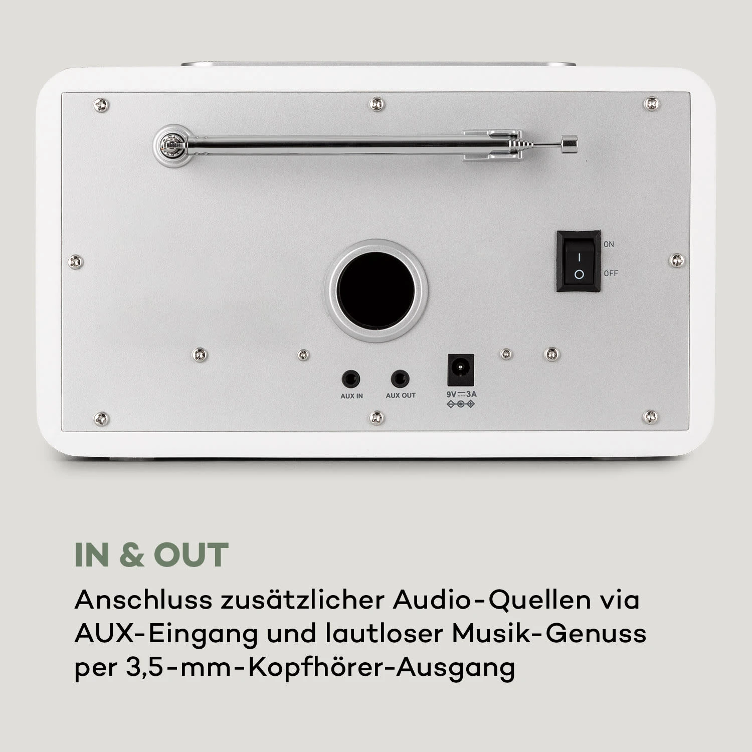 - Anschlüsse: 1 x 3,5-mm-Klinke-AUX-Eingang, 1 x 3,5-mm-Klinke-AUX-Ausgang, 1 x 3,5-mm-Klinke-Kopfhörer-Ausgang