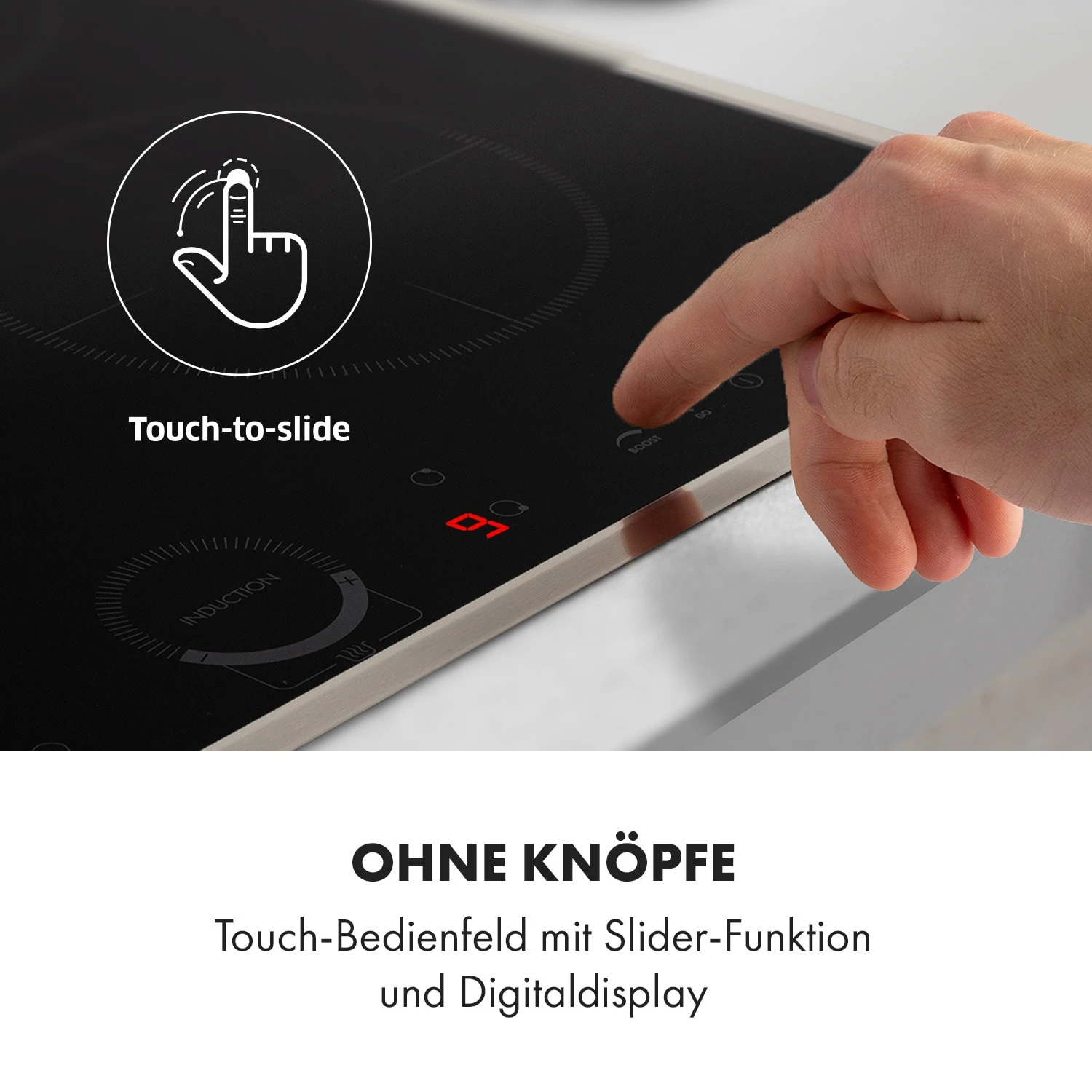 Vier Kochflächen für den Genuss bietet das Klarstein Delicatessa 60 Hybrid Prime Einbaukochfeld bei einer Gesamtleistung von bis zu 7000 Watt, die sich mit 2 x 2000 Watt und 2 x 1500 Watt auf die einzelnen Kochflächen verteilen und die Inhalte von Töpfen und Pfannen in Spitzenzeiten zum Kochen bringen. Dabei vereinen sich per VarioHeating die beiden linken Kochzonen zu einer Flexzone: Mit maximaler Flexibilität passt sie sich dank Topferkennung an die Größe der darauf gesetzten Töpfe, Pfannen oder Kasserolen an und erhitzt so auch großes Kochgeschirr, das nicht auf ein einzelnes Kochfeld passt. Damit verbraucht die Delicatessa 60 Hybrid Prime zum einen wirklich nur die Energie, die für den Topf passend ist und ermöglicht zum anderen die Nutzung fast jeder Topf- oder Pfannengröße. Alle Felder lassen sich separat in ihrer Leistung regeln und verfügen über eine ThermoBoost-Funktion, mit der die Leistung zum schnellen Erhitzen nochmals auf bis zu 2800 Watt gesteigert wird. Bedient wird das Klarstein Delicatessa 60 Hybrid Prime Glaskeramik-Kochfeld unkompliziert mit einem integrierten SenseControl Touch-Panel mit Touch-to-slide-Regler zur Leistungskontrolle und Digitaldisplay. So durchbrechen weder Knöpfe noch Regler die Oberfläche der Küchenzeile. Neben der Leistung kann für jedes Kochfeld ein bis zu 99-minütiger Timer programmiert werden, der entweder nach Ablauf der eingestellten Zeit die Kochplatte abschaltet oder ein akustisches Signal ertönen lässt.