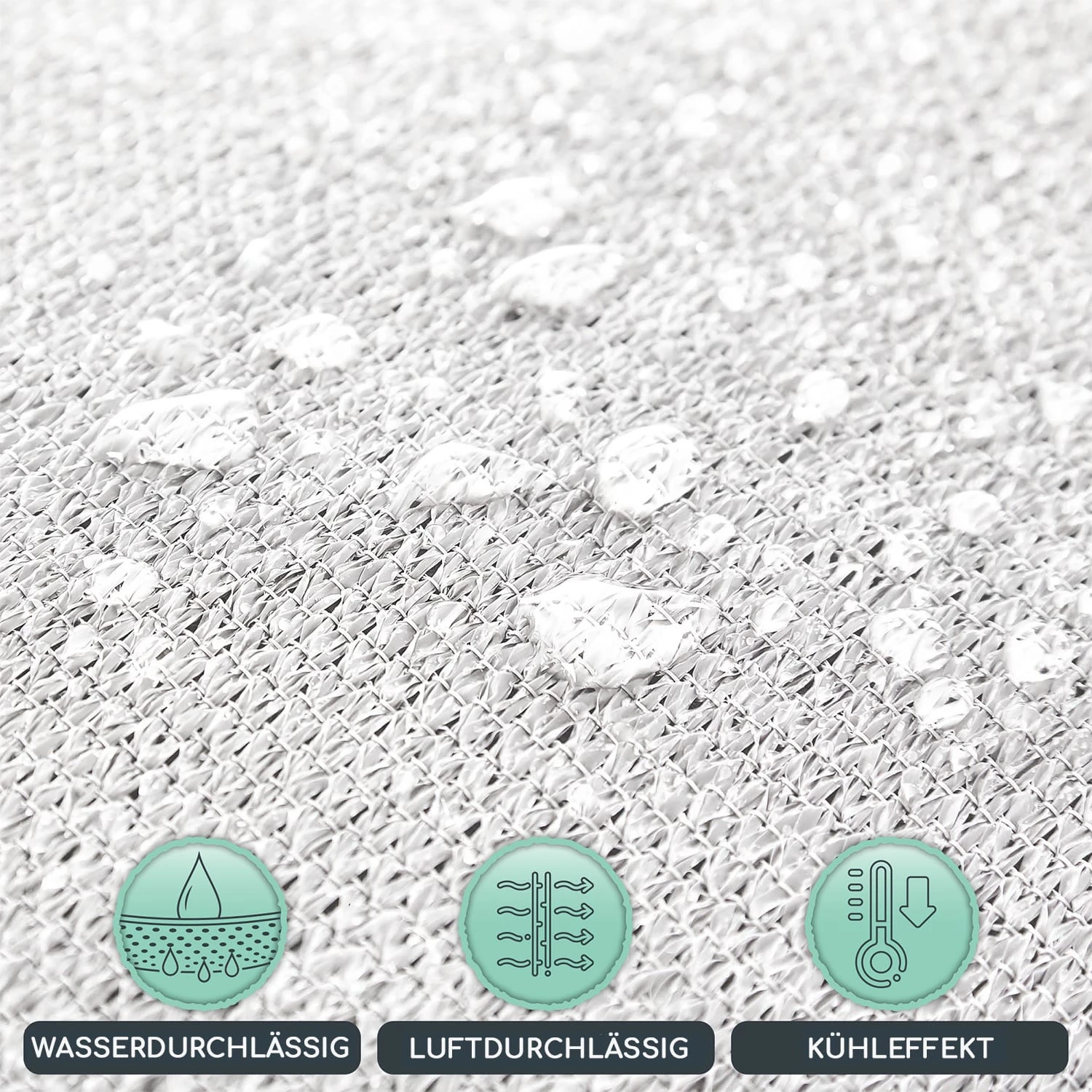 Dank der rostfreien Ringe aus Edelstahl ist die Befestigung sehr unkompliziert. Ziehe einfach die Seile durch die Befestigungsringe, welche du in der Umgebung beliebig anbindest. Für eine dauerhafte Anbringung empfehlen wir dir, anstelle der Seile, Spann- oder Karabinerhaken zu verwenden. Dank des reißfesten und strapazierfähigen Polyester-Materials kannst du das Sonnensegel sehr straff und glatt aufspannen. Zudem ist das Material sehr luftdurchlässig, was dafür sorgt, dass sich unter dem Dach keine Hitze staut. Das Segel hält den Regen ab und ist zudem sehr belastbar, durch festes Material, hochwertige Verarbeitung und doppelte Nähte.