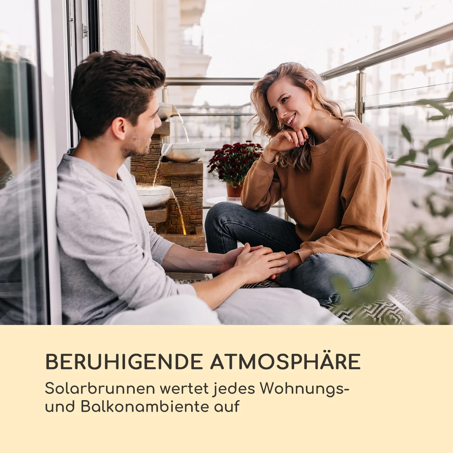 Der blumfeldt Fez Solar-Kaskadenbrunnen ist äußerst dekorativ und eine Zierde für jeden Garten, Balkon oder das Wohnzimmer. Mit der Kraft der Sonne lässt er das Wasser zwischen seinen drei Stufen fließen und hilft, die Welt mit seinem funkelnden Wasserspiel zu entschleunigen.