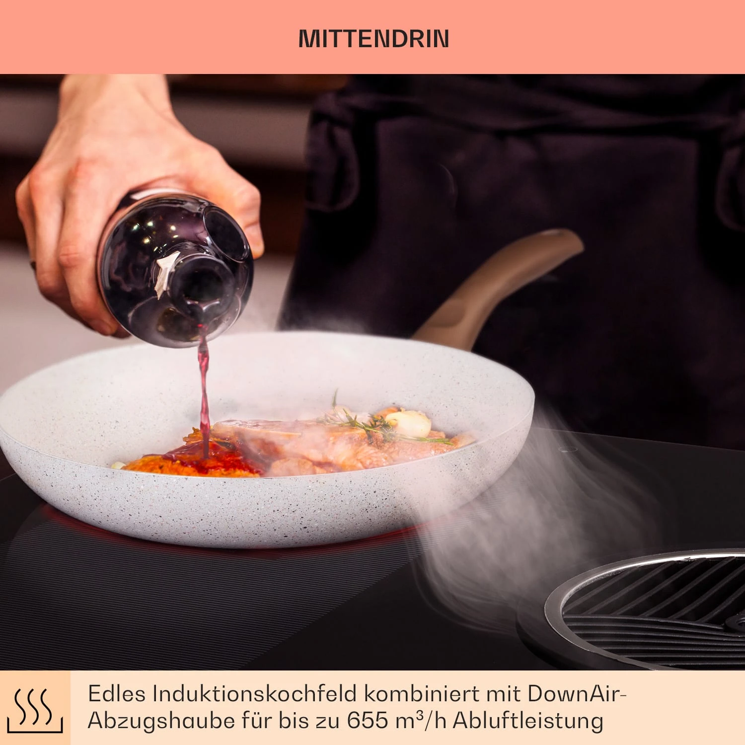 Mittendrin statt nur dabei: Das Klarstein Full House 3.0 DownAir System revolutioniert die Küche, indem es sein Induktions-Kochfeld direkt mit einer DownAir Abzugshaube kombiniert. Nochmals verbessert in der 3. Generation benötigt das System jetzt nur noch ein Minimum an Platz und ist dabei kraftvoll wie nie.