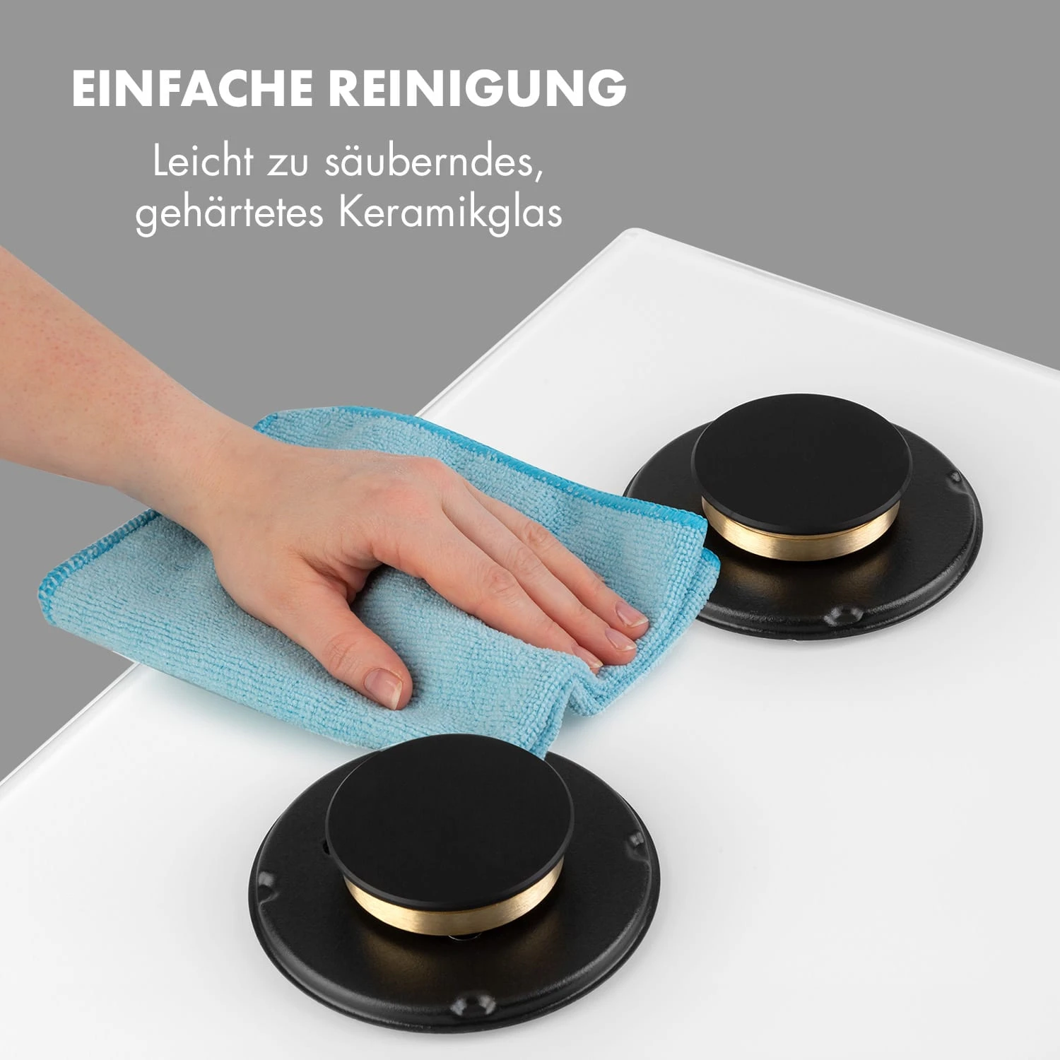 Nach dem Kochen kann das Gaskochfeld bei Bedarf ganz einfach gereinigt werden: Zu diesem Zweck besitzt es eine Oberfläche aus leicht zu säuberndem, 8 mm dickem, gehärtetem Keramikglas. Das sieht nicht nur unglaublich edel aus, es ist auch wunderbar pflegeleicht.