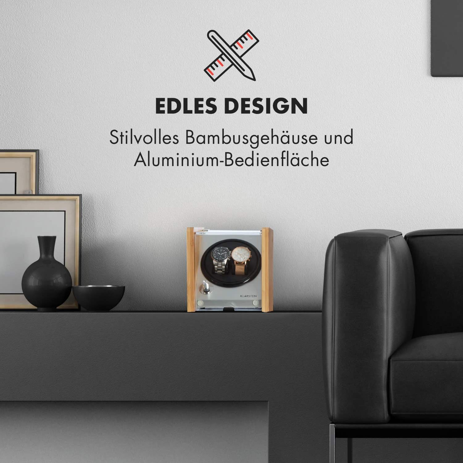 Der Hanoi 2 Uhrenbeweger überzeugt mit einem eleganten Bambusgehäuse, das sich stilvoll in jedes Raum-Ambiente einfügt. Eine Bedienfläche aus gebürstetem Aluminium verleiht der Konstruktion seinen unverwechselbaren Glanz, währende das großzügig geschnittene, von oben und frontal einsehbare Sichtfenster aus Acrylglas einen unverstellten Blick auf die Automatikuhren freigibt.