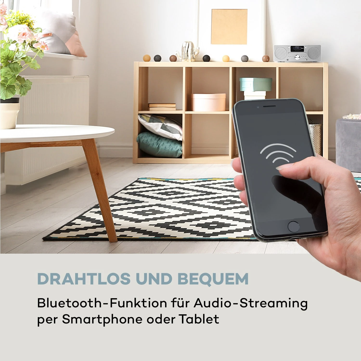 Das elegante Design mit einer Frontverkleidung im Aluminium-Look und die abgerundeten Kanten der auna Harvard Micro-Stereoanlage beherbergen einen digitalen DAB/DAB+ -Tuner sowie einen UKW-Tuner. Von dem enormen Angebot an Sendern können insgesamt bis zu 80 gespeichert werden. RDS-Informationen (z.B. Titel, Interpret) werden auf einem LC-Display dargestellt. Ein Equalizer mit vier Presets, eine X-Bass-Funktion, ein Sleep-Timer und eine Weckfunktion gehören zu den weiteren Features der elitären Microanlage. Die Bedienung erfolgt direkt am Gerät oder bequem per Fernbedienung von der Couch aus.
