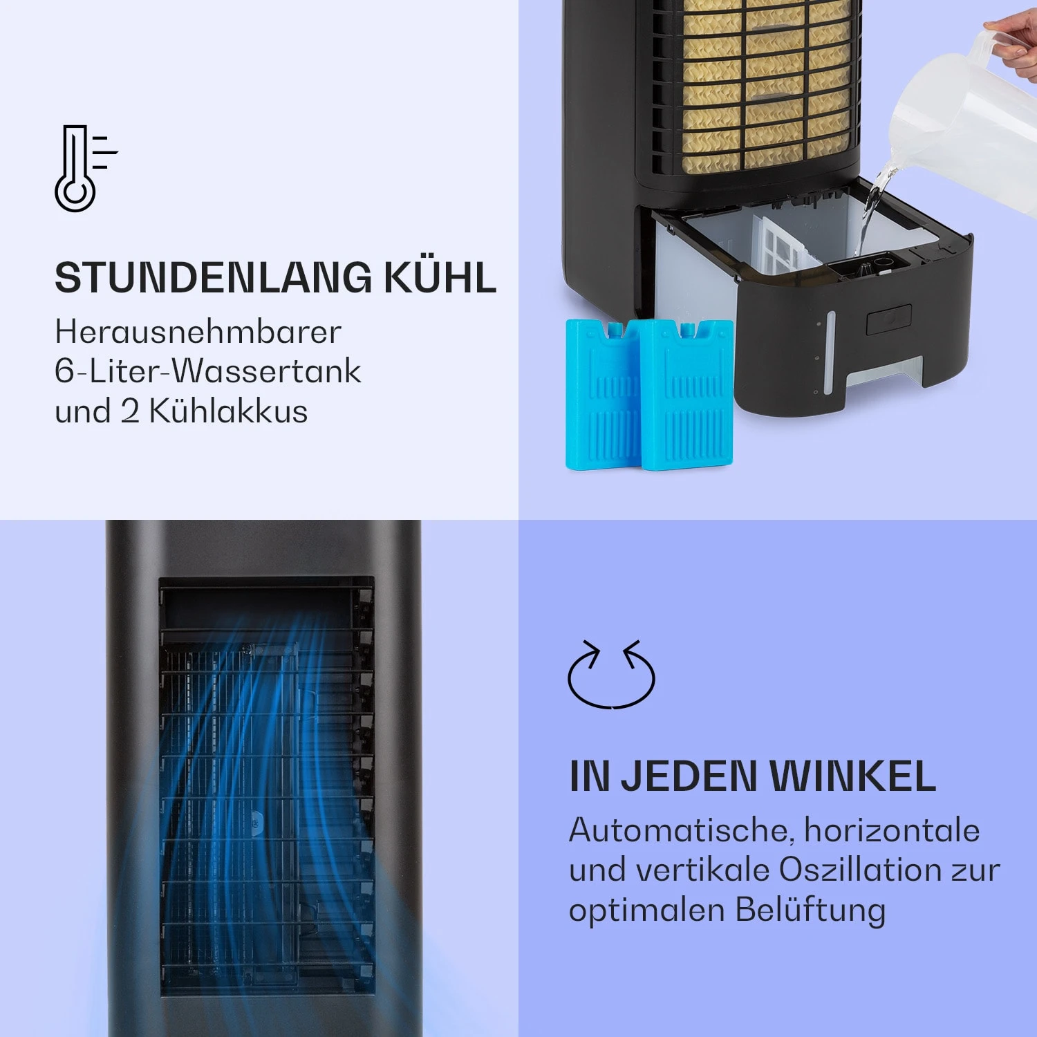 Kühle Erfrischung an heißen Tagen: Der Klarstein IceWind Max 3-in-1 Luftkühler versorgt dich zuverlässig mit einem kühlenden Luftstrom und überzeugt auch an kalten Tagen mit seinen praktischen Funktionen als Luftbefeuchter. Dank automatischer, horizontaler und vertikaler Oszillation, 4 Geschwindigkeiten und 3 Windmodi bewahrst du immer einen kühlen Kopf. Durch Verdunstung aus dem 6 Liter Wassertank wird der Luftstrom angenehm gekühlt. Das hilft, dich an heißen Tage punktgenau zu erfrischen – egal ob am Schreibtisch, auf der Couch oder beim Spiel mit den Kindern. Und im Winter befeuchtest du so direkt die Luft, um befreit durchzuatmen.