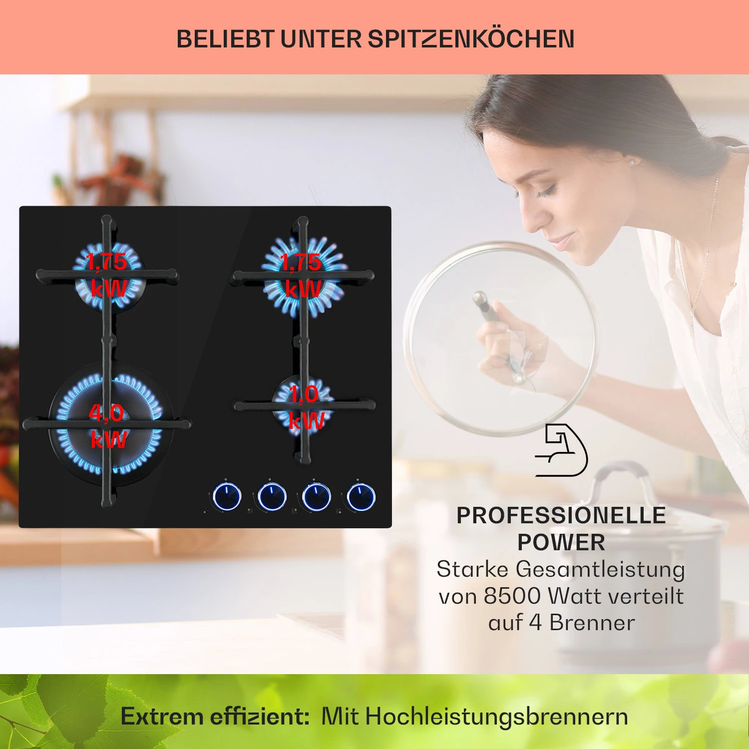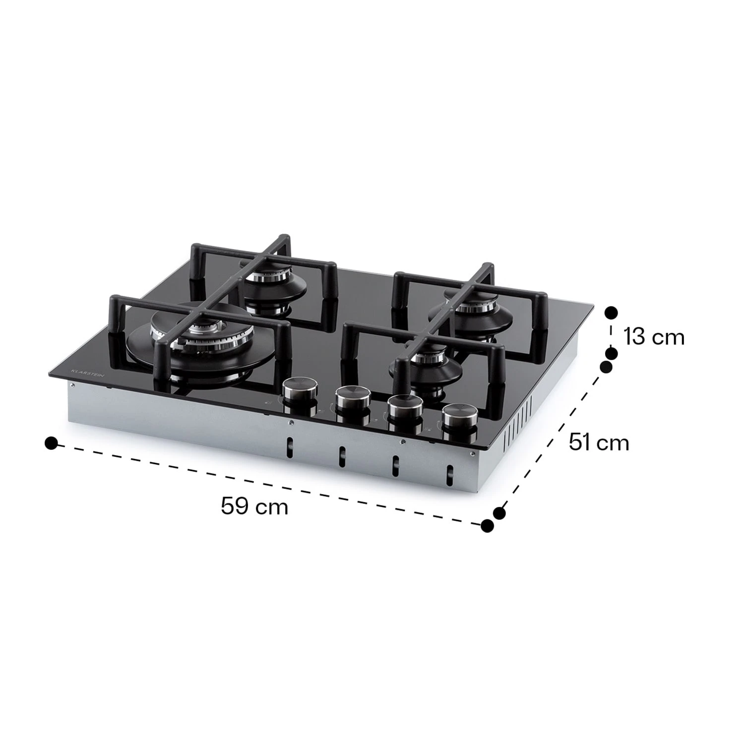 Auf dem platzsparenden Klarstein Illuminosa 4 Kochfeld befinden sich vier hochwertige Sabaf-Brenner, die mit einer Leistung von 4 kW, 2 x 1,75 kW und 1,0 kW ordentlich einheizen. Alle Brenner verteilen die Hitze gleichmäßig in der Mitte und an den Rändern der Töpfe oder Pfannen, alles wird perfekt und bestmöglich gegart. Die beiden Kreuze aus massivem Gusseisen sind für beinahe alle Arten von Kochgeschirr geeignet und sitzt passgenau und kippsicher über den Flammen. Dafür sorgt die integrierte Magnethalterung, sodass keine Mulde oder Befestigungslöcher die Oberfläche des Herds mehr stören. Die Bedienung ist dank der selbsterklärenden Symbole an den großen Drehknöpfen absolut intuitiv. Für optimale Sichtbarkeit der Einstellungen sorgen integrierte LEDs, die die Regler zum Leuchten bringen. In der leichten Regulierbarkeit liegt auch der große Vorteil von Gasherden: Die Hitzezufuhr kann während des Kochvorgangs immer wieder direkt angepasst werden. Änderungen an der Flammengröße wirken sich unmittelbar in Temperaturänderungen an Topf oder Pfanne aus. Natürlich haben wir auch auf die Sicherheit am Herd geachtet: Zusätzliches Feuer zum Entzünden ist nicht nötig. Die Gasflamme wird einfach per elektrischer Zündung entfacht. Der Flammenausfall-Schutz schließt die Gaszufuhr zum Brenner, sollte die Flamme aus irgendeinem Grund einmal ausfallen.