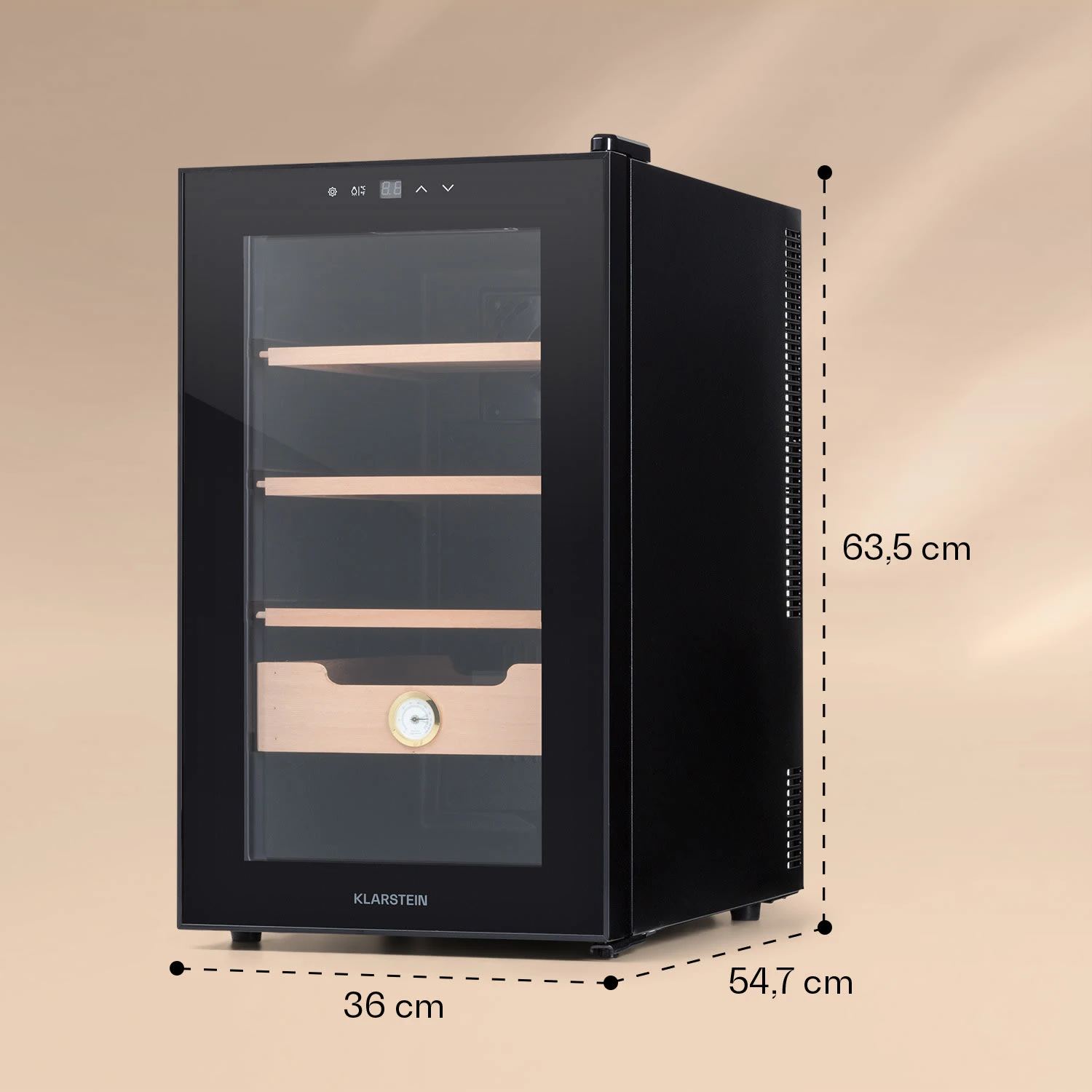 Der State of the Art Lagerplatz für edlen Tabakgenuss: Der Klarstein El Presidente 48 Humidor sorgt für optimale Lagerbedingungen, um das volle Aroma edler Zigarren langfristig zu erhalten. Im 48 Liter großen Innenraum bieten drei Lagerebenen und ein Lagerfach aus Zedernholz viel Platz für deine Zigarren: Geräuscharm, bestens gekühlt und mit optimaler Überwachung der Luftfeuchtigkeit. Die blaue Innenbeleuchtung sorgt für eine stilvolle Szenerie hinter der Panorama-Glastür.