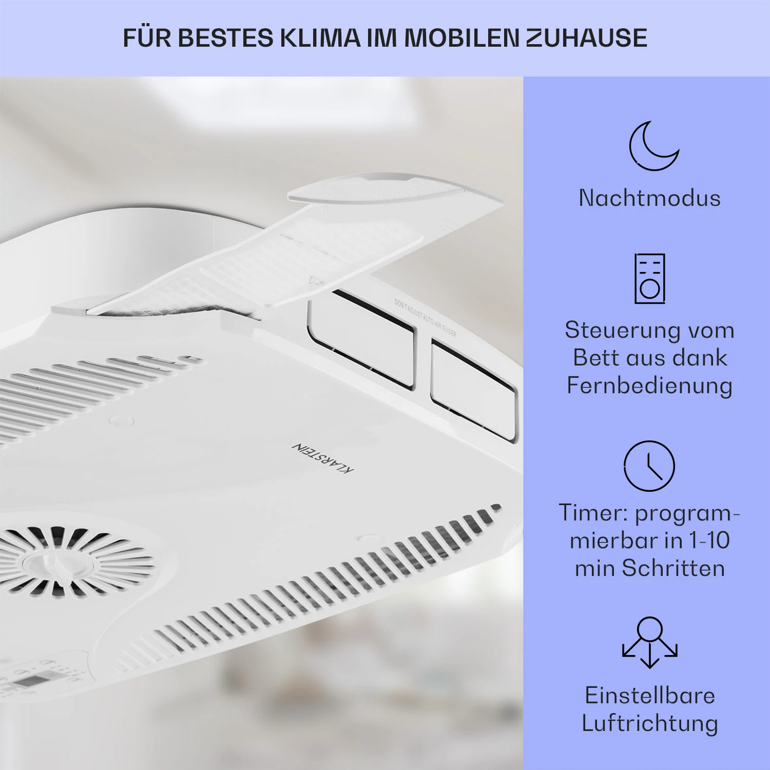 Mit kühlem Kopf auf Achse: Die Klarstein Klimamobil Wohnmobil-Klimaanlage versüßt den Aufenthalt im Caravan mit Wohlfühltemperaturen an kalten und heißen Tagen. Ganz gleich ob Kühlen oder Heizen, Frischluftzufuhr oder Luftentfeuchtung: Das Splitgerät ist für alle Belange gerüstet, um Temperaturen zwischen 16 und 30 °C zu erreichen. Der Ventilator mit Oszillation sorgt dabei für eine angenehme Luftzirkulation. Der Klarstein Klimamobil RV-Air-Conditioner eignet sich zur Montage auf Dachöffnungen von 356×356 mm und Dächern mit einer Dicke von 30 bis 80 mm.