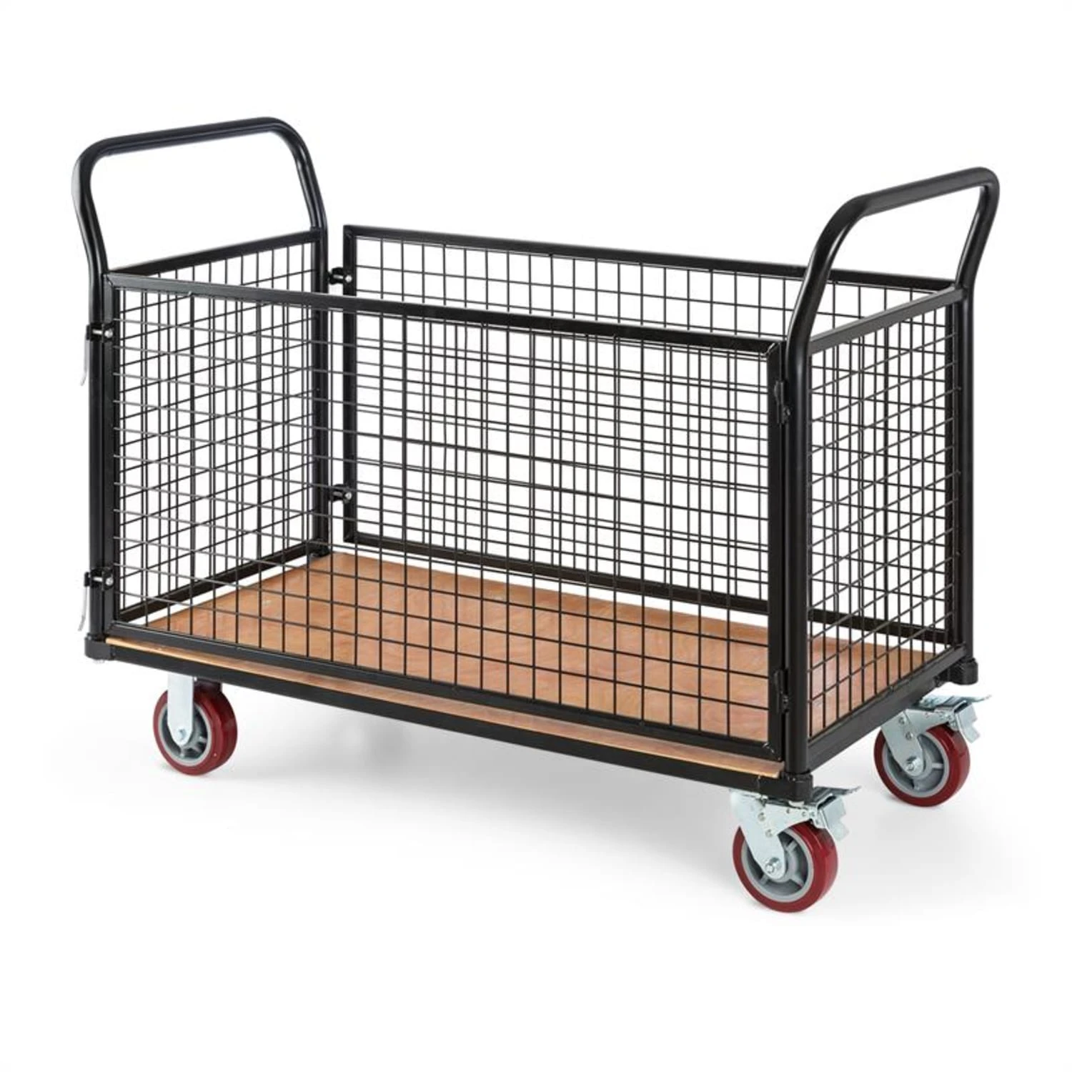 Die 120 x 65 cm große Ladefläche des Waldbeck Loadster Magazinwagens eignet sich bestens, um auch unhandliche und große Pakete leicht zu transportieren. Die Gitterwände ermöglichen eine sichere Zuladungshöhe von 61,5 cm, ohne das Teile während der Fahrt vom Wagen fallen. Das entspricht einem Ladevolumen von etwa einem halben Kubikmeter. Für eine einfache Beladung des Transportwagens lassen sich die Seitenwände entweder im Scharnier aufklappen oder mit einem einfachen Handgriff ein- und aushängen. Jeweils zwei Schiebebügel sichern die Seitenwände im Rahmen.