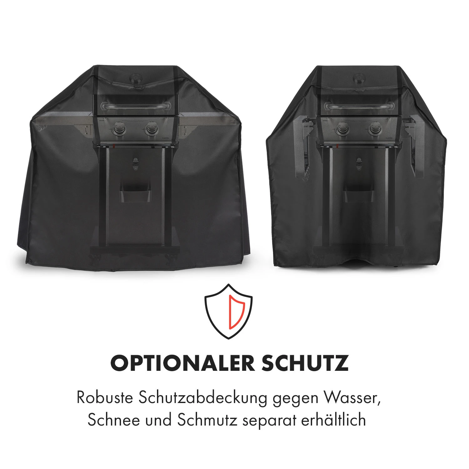 Grillen auf offener Flamme ohne Kohlestaub und Fummelei beim Anzünden? Mit dem Klarstein Lucifer 2.0-T Gasgrill ganz einfach. Dank SNAP-JET-Ignition-System mit integrierter Piezozündung werden einer oder beide Brenner per Knopfdruck entzündet. Der Grill abreitet dank Gasbrennern mit dem InstantReady Concept das heißt, er ist sofort einsatzbereit, ohne lange auf das Durchglühen der Kohle oder Aufheizen der Grillplatte warten zu müssen. Beide Brenner sorgen jeweils mit 3,5 kW Heizleistung für Grillhitze unter dem gusseisernen Grillrost. Der bietet sich mit 45 x 44 cm Fläche für verschiedenstes Grillgut an: herzhafte Steaks, knackige Würste, leckeres Grillgemüse oder saftiger Fisch. Die große Grillplatte aus emailliertem Gusseisen sorgt für eine gleichmäßige Verteilung der Hitze, sodass auch in Randlagen der Grillzone alles schön kross gebraten wird. Mit der großen, doppelwandigen Edelstahl-Haube sind auch Spezialitäten des passiven Grillens wie Pulled Pork oder SpareRibs kein Problem. Das integrierte Thermometer erleichtert dabei die Temperaturüberwachung. Ist der Grill zu heiß oder zu kalt, wird einfach an den stufenlosen Drehschaltern nachjustiert. Für viel Platz beim Grillen sorgen die beiden Seitentische aus Edelstahl, die nach Belieben ein- oder ausgeklappt werden – perfekt für Balkone mit kleinem Platzangebot. Jeder Seitentisch stellt 32,5 x 45,5 cm Abstellfläche zur Verfügung – genug für Schüsseln, Pfannen, Besteck, Getränke oder Gewürze. Haben wir an alles für Ihr perfektes Grillerlebnis gedacht? Na klar, denn der Lucifer 2.0-T besitzt auch noch einen integrierten Flaschenöffner für die schnelle Erfrischung, vier Haken zum Aufhängen von Grillzange, Spießen oder Pfannenwendern, einen emailierten Warmhalterost für fertiges Grillgut und ein Gewürzregal für Pfeffer, Salz, Öl, Dressing und was Sie sonst noch brauchen – hier ist einfach alles am Grill und alles zur Hand!