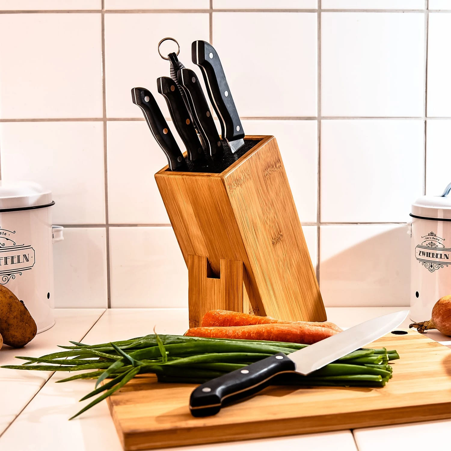 Sicher, praktisch, nachhaltig. Im Klarstein Messerblock sind deine Messer und Küchenutensilien bestens aufbewahrt. Der innovative Einsatz aus PET-Borsten erlaubt das Aufbewahren von 5 bis 10 Messern, Scheren, Wetzstählen und ähnlichem bis 20 cm Länge. Dabei kannst du die Messer ganz nach Belieben in den schrägen Block stecken. Der Einsatz ist herausnehmbar und kann ganz einfach in der Spülmaschine gereinigt werden. Ästhetisch ansprechend und nachhaltig präsentiert sich der Block in einer Hülle aus stabilem Bambus.