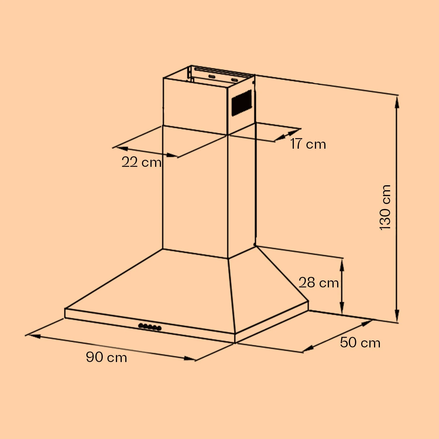 - Maße (Haube ohne Kamin): ca. 90 x 28 x 50 cm (BxHxT)