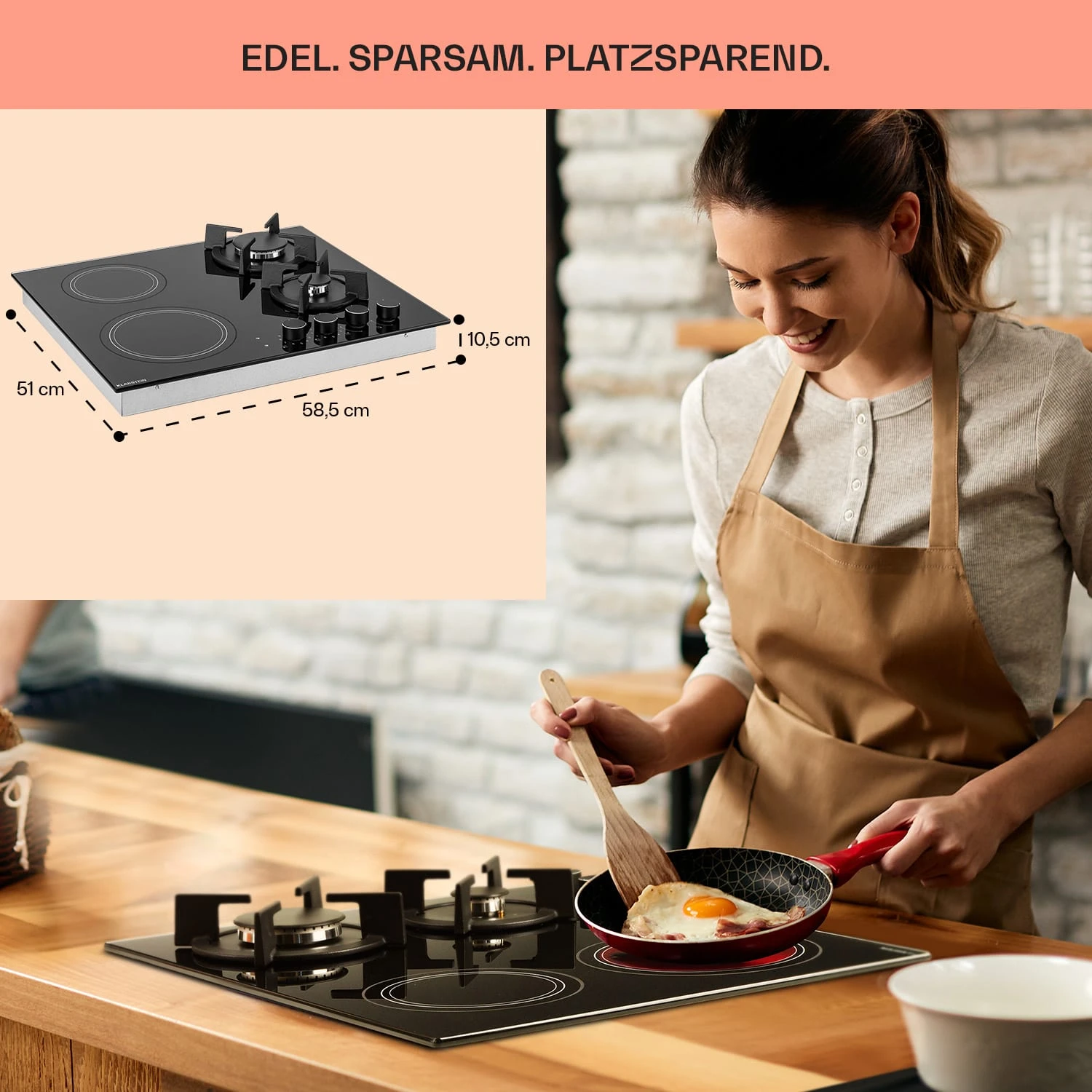 Das MultiChef 4 Kombi-Gaskochfeld von Klarstein ist die ideale Verschmelzung von 2 Gaskochstellen und 2 Glaskeramikkochfeld zu einem echten Multitalent. Mit insgesamt 6,4 kW Leistung, 2 unterschiedlichen Brennergrößen sowie 2 gusseisernen Topfträgern ist es für jede erdenkliche Mahlzeit bestens ausgerüstet. Über die leichtgängigen Drehregler kannst du die Flammengröße jederzeit bequem anpassen. Die Oberfläche aus gehärtetem Keramikglas sieht bei nicht nur edel aus, sie ist auch wunderbar pflegeleicht. Das elektrische Zündsystem mit Flammenausfallschutz sorgt für eine sichere Handhabung.