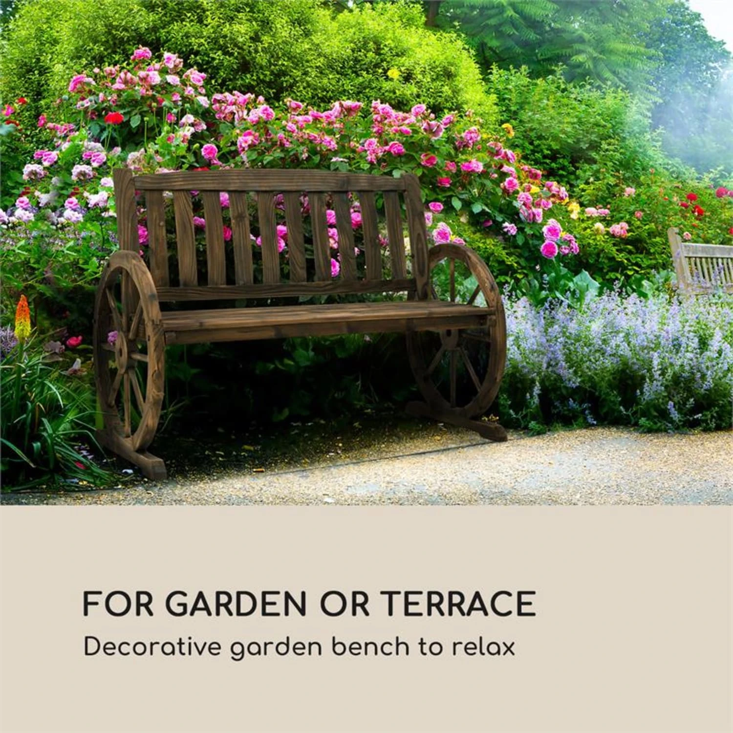 Wie zwei Wagenräder geformt vermitteln die Seitenstützen der Gartenbank die gemütliche Atmosphäre einer sonnendurchfluteten Bergalm und bringen rustikales Flair nach Hause. Zwischen liebevoll angelegten Blumenbeeten oder bunt bepflanzten Balkontöpfen wird die Gartenbank in jedem Heim zum dekorativen Blickfang. Damit die Sitzbank ihre Farbe und Beständigkeit erhält, wurde das verwendete Tannenholz dem Flame Shield Treatment, einer Brandbehandlung, unterzogen. So ist sie vor Wind und Wetter geschützt, erhält aber dank der künstlich gealterten Oberfläche zusätzlich einen ganz eigenen Charme.