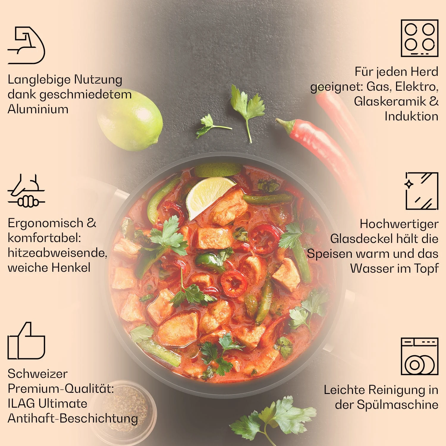 Für Abwechslung auf dem Herd – Design made in Berlin: Das Klarstein Noto Endurance Kochtopf-Set bringt dir deine neuen praktischen Helfer in der Küche, wenn es darum geht, Kaltes heiß zu machen. Das Set enthält drei Kochtöpfe mit 20, 24 und 28 cm Durchmesser sowie eine Kasserolle mit 16 cm Durchmesser. Alle vier Töpfe sind aus geschmiedetem Aluminium und dank ihrer Edelstahlböden für alle Arten von Küchenherd von Gas bis Induktion geeignet. Ergonomische Cool-Touchgriffe machen das Handling ganz einfach. Die passenden Glasdeckel halten die Hitze im Inneren und sparen so nicht nur Energie, sondern lassen Speisen auch schneller kochen. Die PTFE-Anti-Haft-Beschichtung ist PFAS-frei und ausgesprochen langlebig. Und natürlich ist das Klarstein Noto Endurance Kochtopf-Set komplett Spülmaschinenfest für besonders einfache und unkomplizierte Reinigung. Drei enthaltene Filze schützen die Töpfe, wenn du sie ineinander stapelst oder dienen dir direkt als Untersetzer. So macht Kochen Spaß!