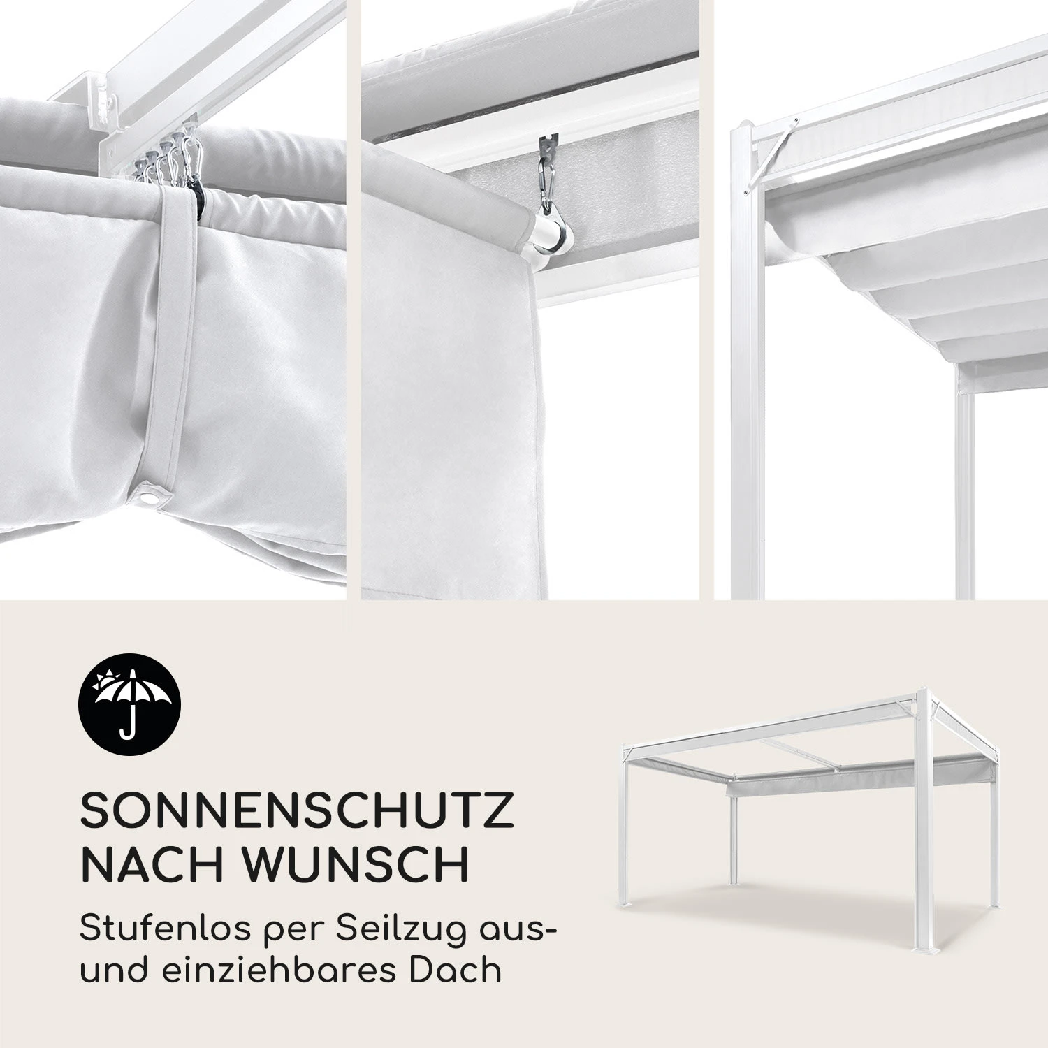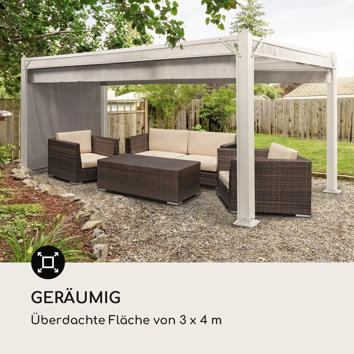 Mit dem stufenlos raffbaren Stoffdach aus 180 g/m² Polyester erhältst du die volle Kontrolle über Schatten und Sonne. Der Seilzug lässt das Sonnendach des Pavillons in seinen Führungsschienen geschmeidig vor- und zurückgleiten, die wasserabweisende Beschichtung schützt vor Schimmel und kurzen Regenschauern. Durch die flexibel auf- und abrollbaren Seitenteile aus 160 g/m² Polyester-Stoff bleibst du die ganze Zeit windgeschützt.
