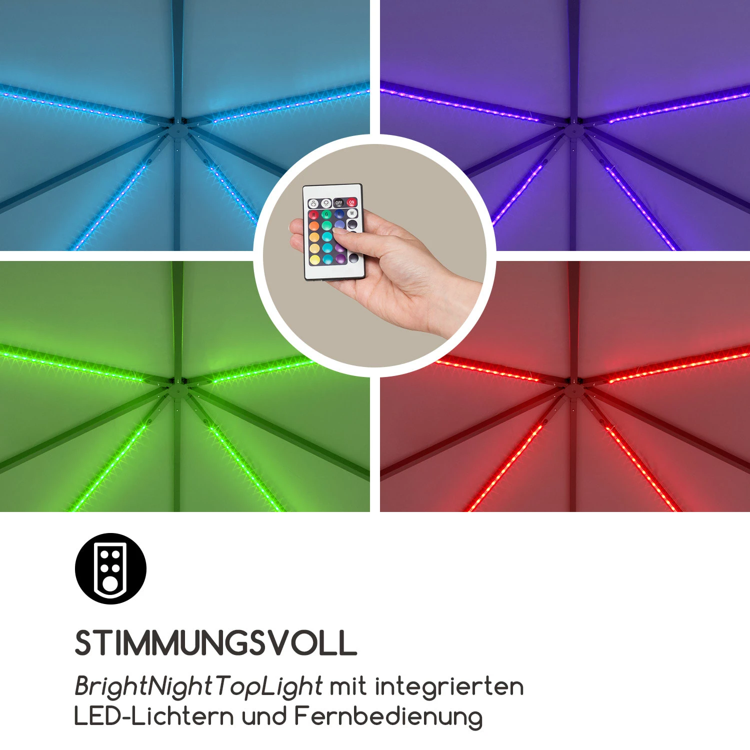 Licht an! Der Blumfeldt Pantheon Illumina Pavillon macht mit seiner integrierten LED-Ambientebeleuchtung Terrasse oder Sitzecke zum stimmungsvollen Tempel der Erholung – egal ob für fröhliche Partyabende oder romantische Candlelight Dinner im Grünen.