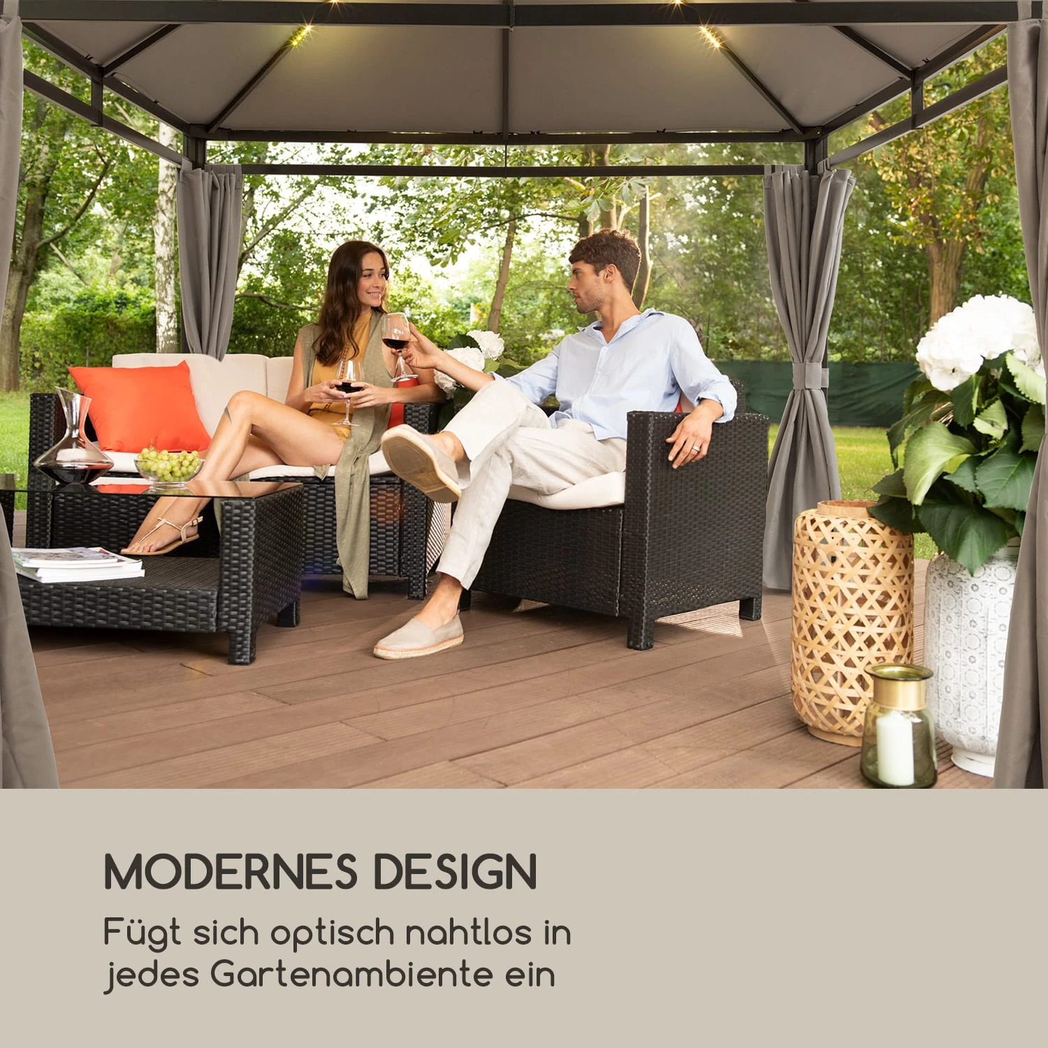 Für noch mehr Heimeligkeit im Pavillon sorgen die optional erhältlichen Seitenteile, die vor Sonne, Wind und Wetter sowie vor neugierigen Blicken der Nachbarn schützen.