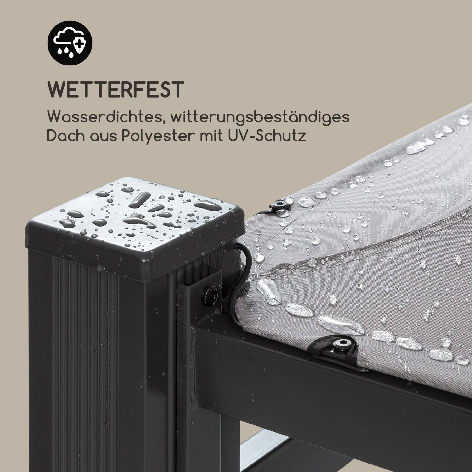 Damit Sie ganz beruhigt sitzen bleiben können, auch wenn ein sommerlicher Regenschauer niedergeht, ist das Spitzdach des Pavillons mit 300 g/m² starkem Polyester bespannt, das eine doppelte PU-Beschichtung besitzt: Die lässt nicht nur kein Wasser bis zu einer Wassersäule von 800 mm durch, sondern besitzt auch einen UV-Lichtschutzfaktor von 80+ – ideal also für alle mit empfindlicher Haut, die sich gern im Freien aufhalten.