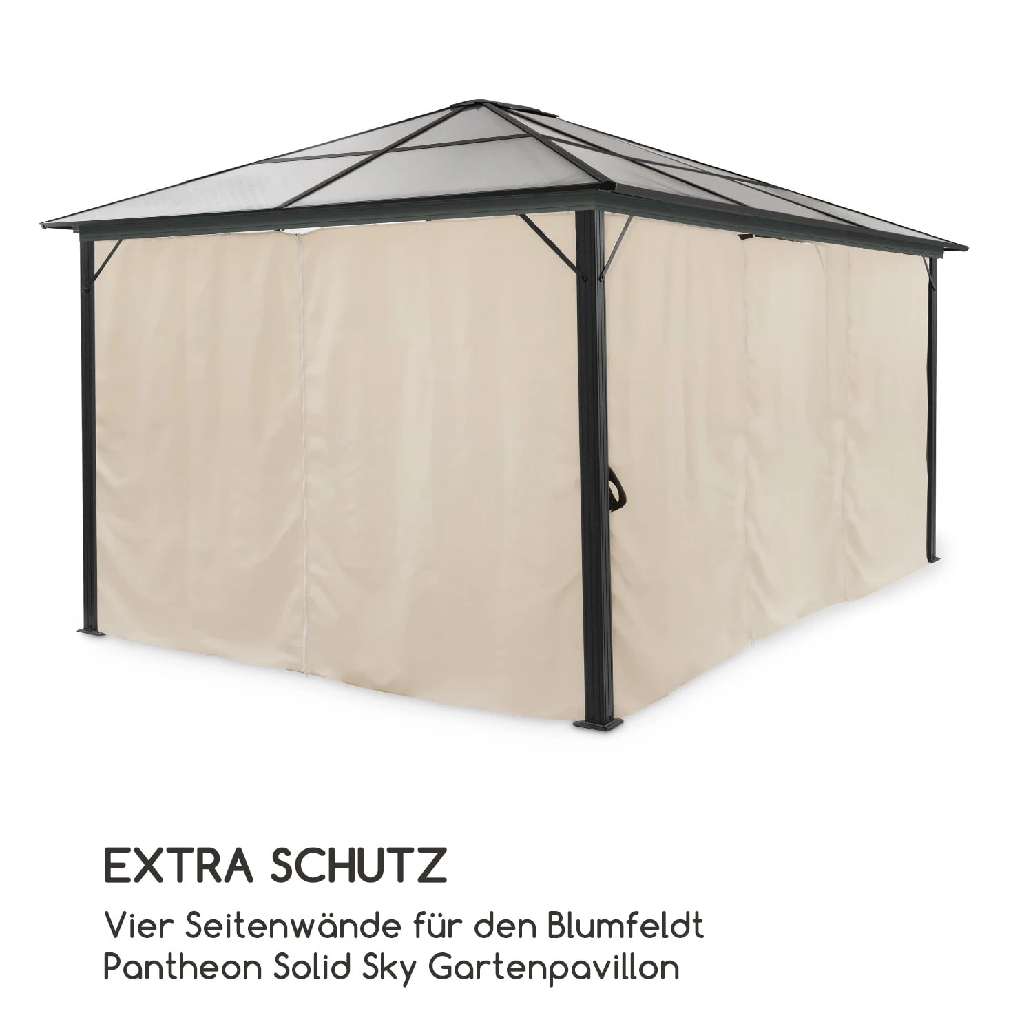 Für noch mehr Heimeligkeit im Pavillon: Die blumfeldt Pantheon Solid Sky Ambient Solar Pavillon-Seitenwände Pantheon Solid Sky sorgen nicht nur für mehr Privatsphäre im Gartenzelt, sondern bringen auch gleichzeitig Schutz gegen Wind und Wetter für den erholsamen Aufenthalt in deinem Tempel der Erholung!