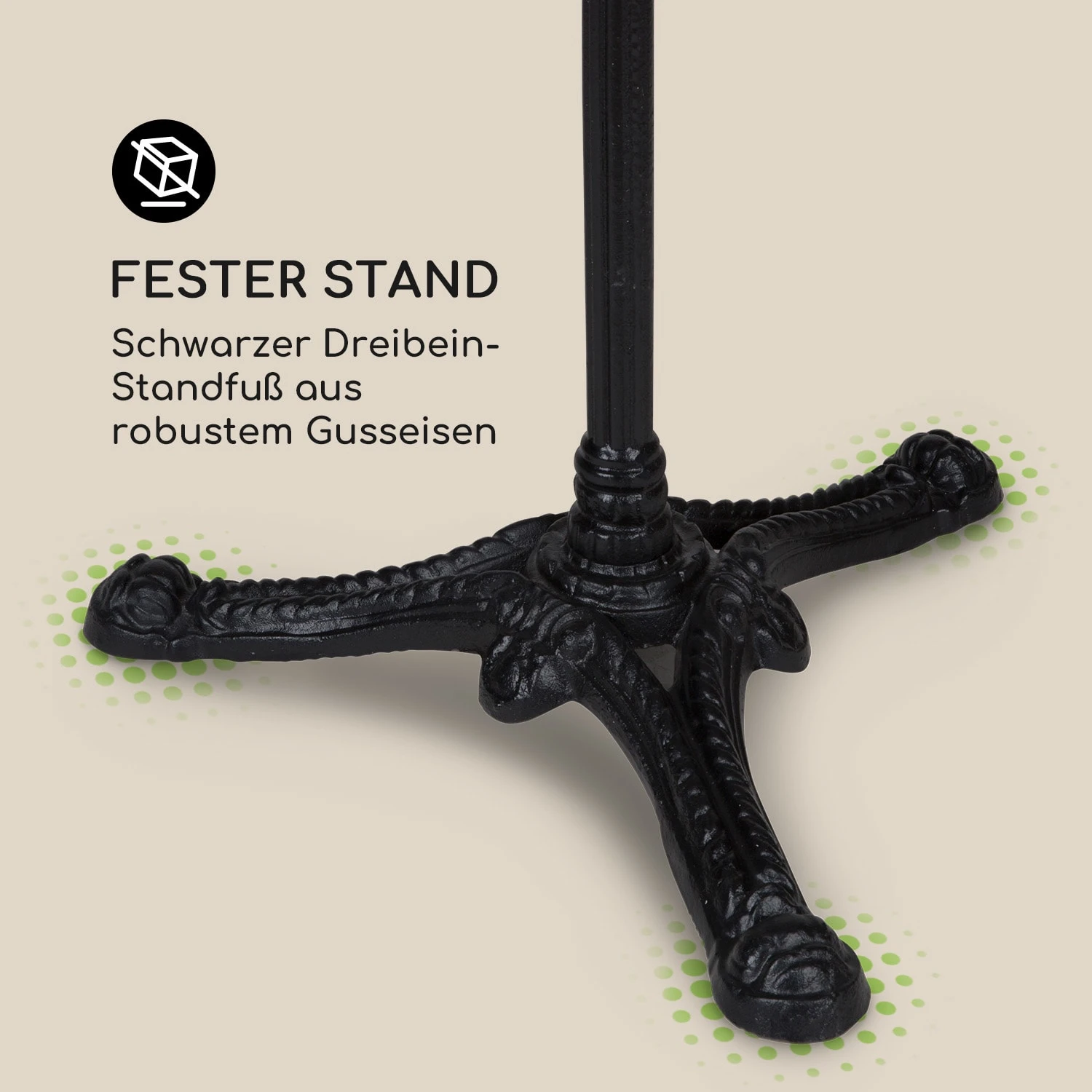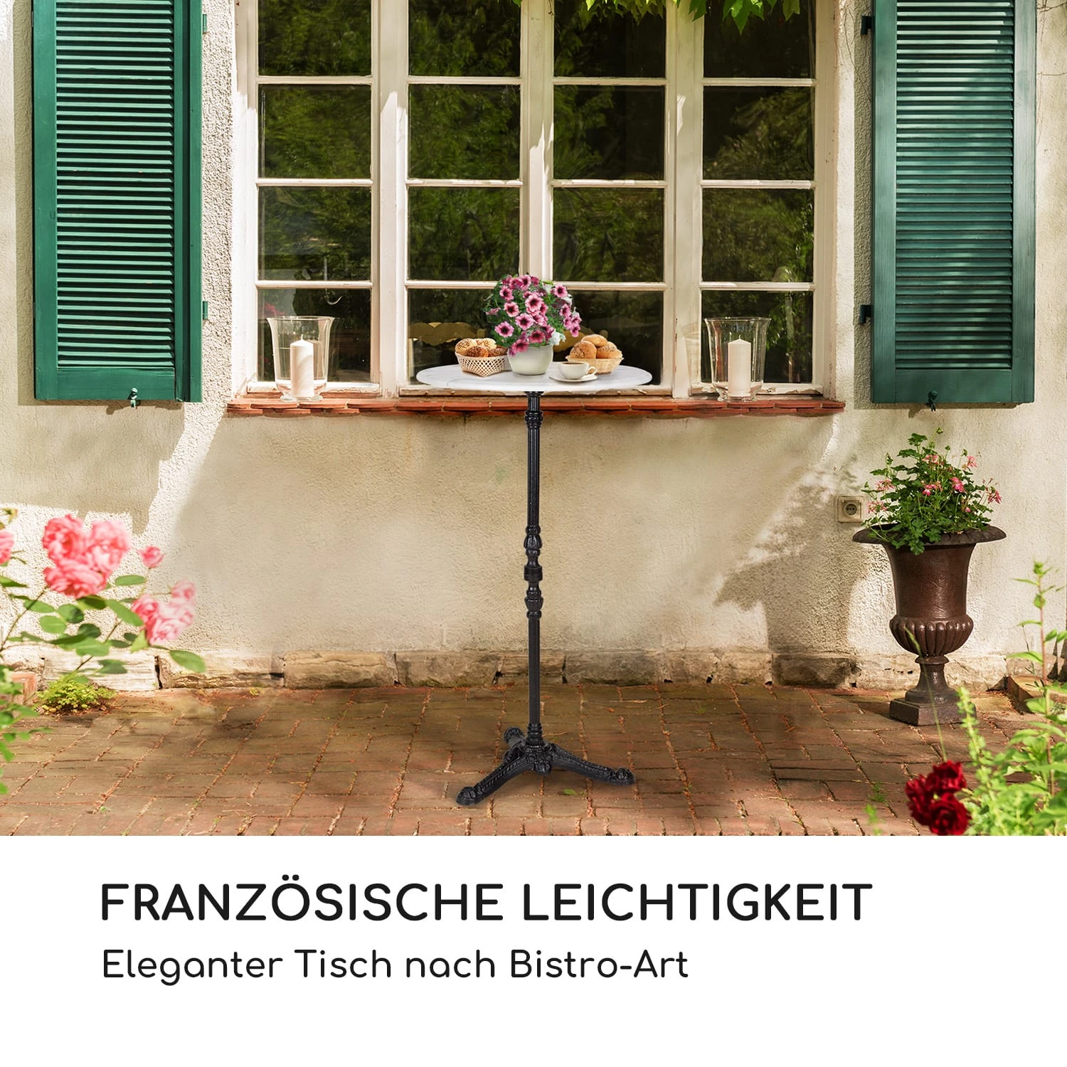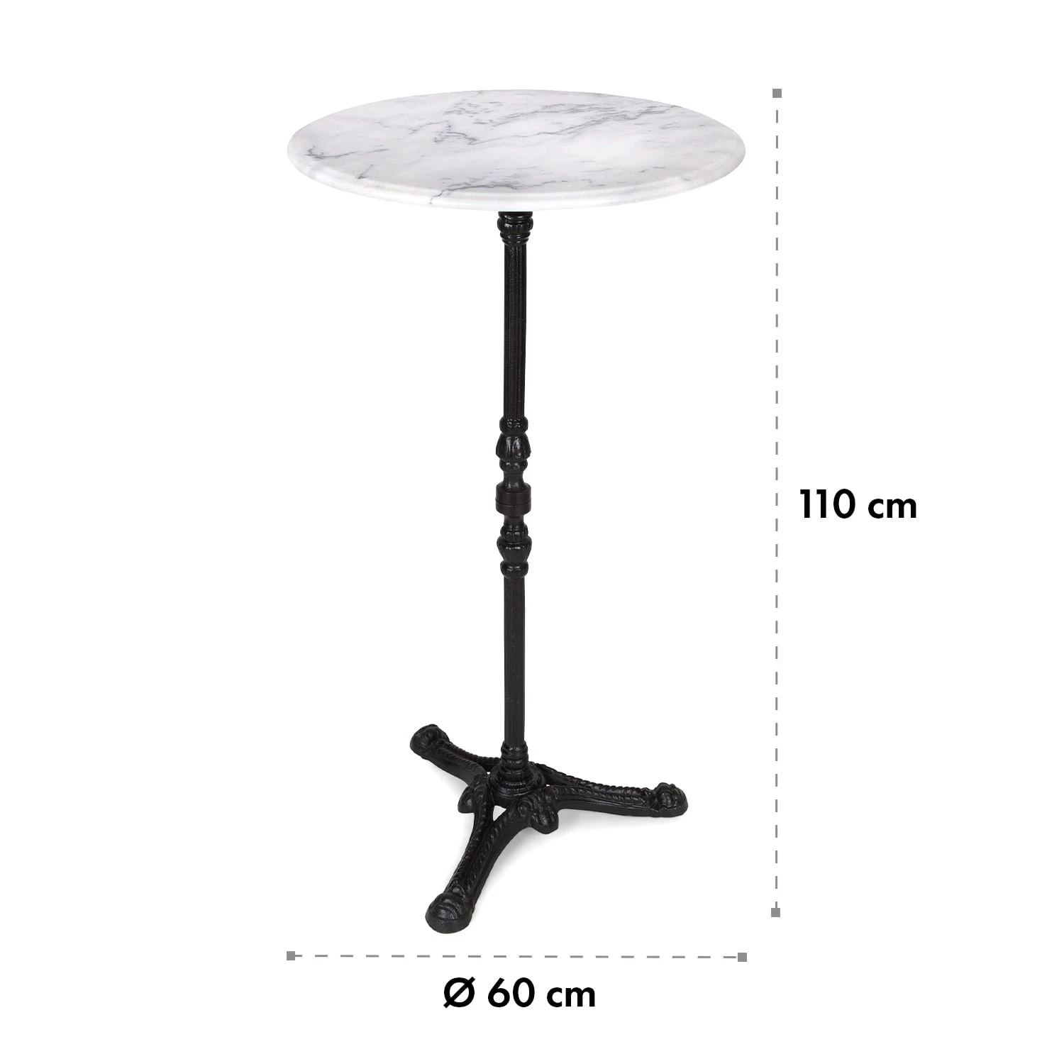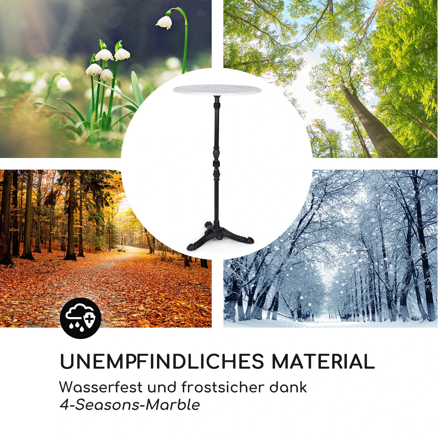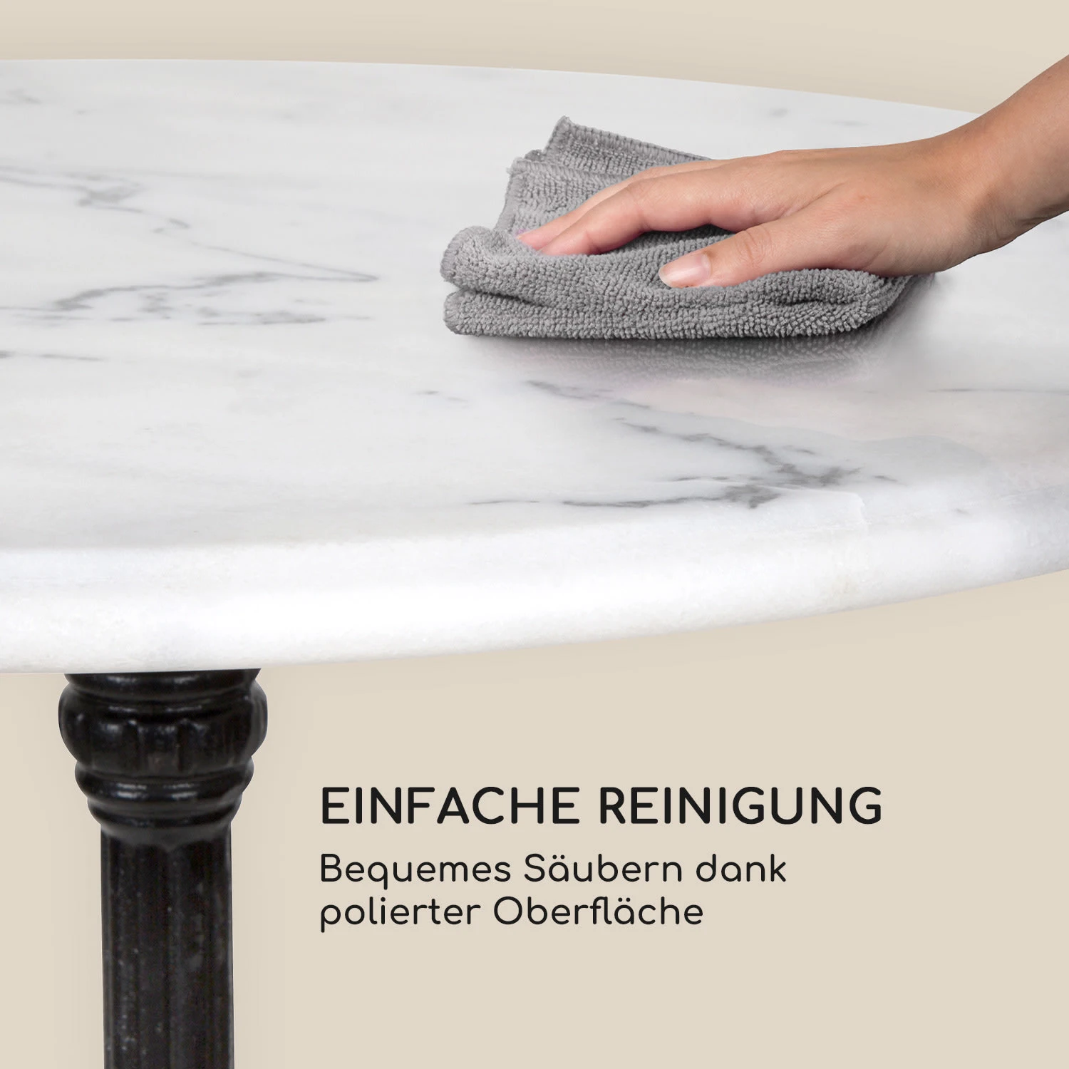 Der Patras Taverna Bistrotisch ist besonders formschön und sowohl für drinnen als auch draußen geeignet: Die 60 cm durchmessende Tischplatte ist aus sauber poliertem, echten Marmor und macht jeden Tisch zu einem Unikat. Maserung und Färbung des Gesteins bringen immer wieder einen ganz eigenen Charakter hervor und verleihen jedem Umfeld neuen Glanz. Der stabile, gusseiserne Dreibein-Standfuß mit floralen Verzierungen verstärkt diesen Effekt zusätzlich und der 4-Seasons-Marble lässt sich nicht nur besonders einfach reinigen, er ist auch unempfindlich gegen Wasser und Frost.