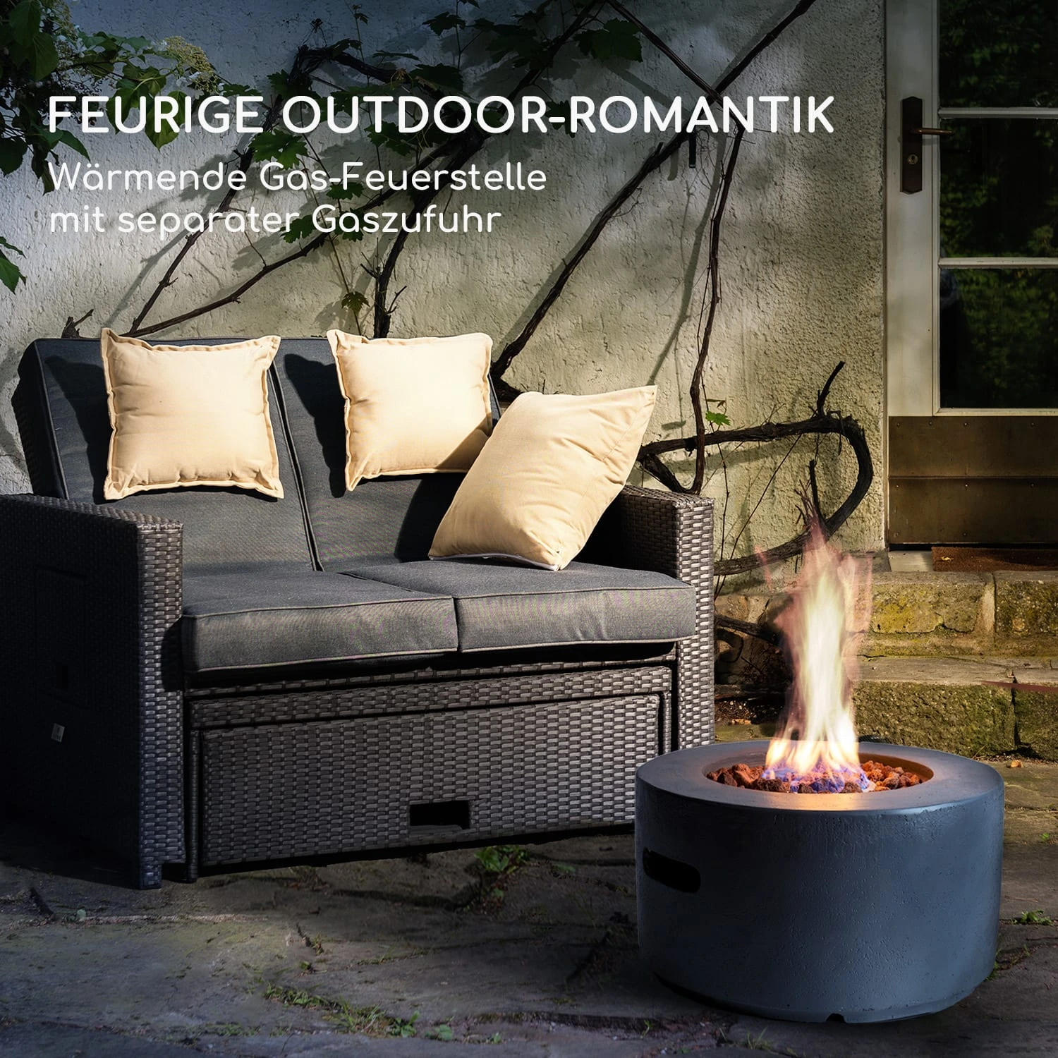 Leistungsstarke Gas-Feuerstelle für Romantik und natürliche Wärme in Outdoor-Oasen: Die blumfeldt Pilos Gas-Feuerstelle verbindet rustikale Schönheit mit komfortabler Funktionalität.