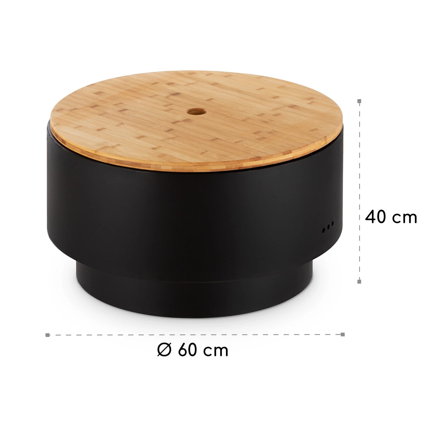 Genieße den Abend im Garten oder auf der Terrasse: Mit der blumfeldt Pompeji Feuerschale & Grill macht es gleich dreifach Spaß. In der 60 cm durchmessenden Feuerschale spenden Scheithölzer, Holzkohle oder Briketts mit flackernden Flammen wohlige Wärme und Lagerfeuer-Atmosphäre. Die solide Schale ist aus 2,5 mm dickem Stahl gefertigt und mit feuerresistenter Farbe versehen – so ist sie witterungsbeständig und robust. Lecker wird es, wenn bei der Pompeji Feuerschale der 56 cm breite verchromte Grillrost aufgesetzt wird. Einfach den Rost auf die Schale setzen und schon kann der Grillspaß losgehen. Der runde Unterbau mit seinen 48 cm Durchmesser sorgt für einen stabilen Stand der Pompeji, egal ob beim Grillen oder bei der Nutzung als Lagerfeuer. Allerdings kannst du die Pompeji Feuerschale mit ihrer mitgelieferten Bambusplatte auch als stylischen Gartentisch nutzen. Ihr runde Form und das elegante Schwarz fügen sich spielend in jedes Garten- oder Terrassenambiente ein.