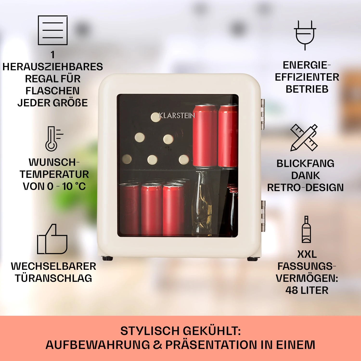 Aus dem stilvollen Klarstein PopLife 48 Getränkekühler im Fifties-Retro-Look schmecken frisch gekühlte Leckereien besonders gut! Ob Getränke oder Snacks: Der stylisch kompakte PopLife 48 Kühlschrank hält immer eine Kleinigkeit in seinem 48 Liter fassenden Innenraum bereit. Dabei arbeitet er sparsam und umweltfreundlich. Damit ist der PopLife 48 ideal für Büros, Gartenhäuschen oder Ferienwohnungen und begeistert mit seinen satten Farben.