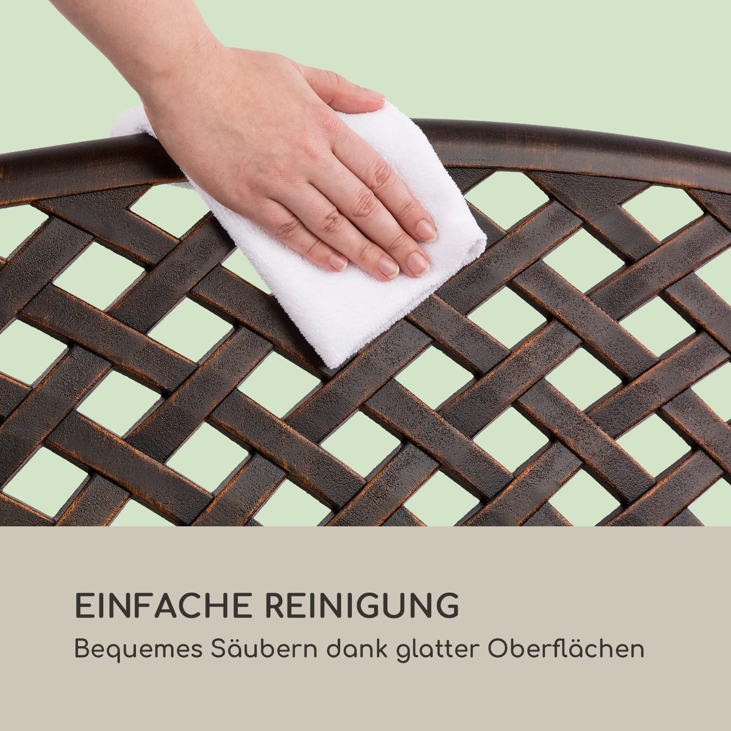 Mit ihrer schmiedeeiserenen Optik besitzt die Gartenbank den Charme längst vergangener Zeiten und bezaubert durch ihre filigrane Eleganz. Komplett aus Aluminiumguss gefertigt hält sie allen Witterungsbedingungen stand und lässt sich aufgrund der glatten Oberflächen wunderbar einfach reinigen. Mit ihrer knapp einen Meter breiten Sitzfläche bietet sie genug Platz für zwei Personen, die es sich zum Entspannen besonders bequem machen können. Wer es noch komfortabler haben möchte, kann eines der optional erhältlichen und passgenauen Sitzkissen verwenden.