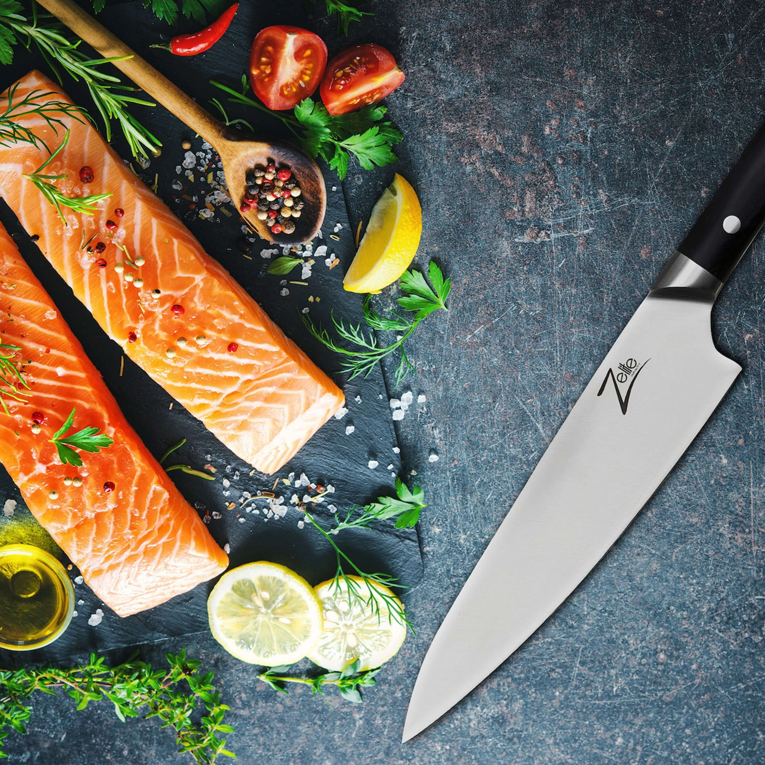 Schlank, wendig, rasiermesserscharf: Wenn du ein leichtes, ultraflinkes Werkzeug für deine Schneide-, Würfel- und Hackarbeiten suchst, wirst du bei der Razor-Edge Messerserie von Zelite Infinity by Klarstein fündig. Diese moderne, japanisch inspirierte Serie besteht aus rostfreiem AUS-8 Stahl und verfügt über Griffe aus schwarzem Pakkaholz mit einer dekorativen Mosaikniete.