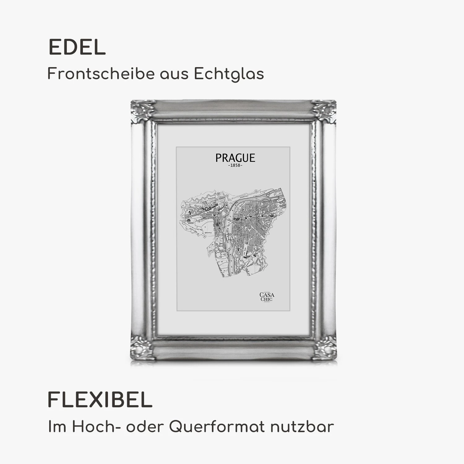Die Regent Bilderrahmen von Casa Chic by blumfeldt sind aus Echtholz gefertigt und mit Gipsornamenten bestückt. Sie bringen deine Fotos und Bilder sowohl im Hoch- als auch im Querformat ideal zur Geltung. Dabei bildet das aufwendig gestaltet Rahmenprofil im Rokoko-Design einen wunderschönen Kontrast zu modernen Einrichtungen. Gestalte Wandcollagen oder arrangiere deine Lieblingsfotos auf dem Sideboard oder im Regal. Das mitgelieferte Passepartout überlässt dir die Wahl des passenden Bildausschnitts. Die Echtglasscheibe schützt nicht nur vor Staub und Schmutz, sie vervollständigt gekonnt den edlen Look der Regent Rahmen.