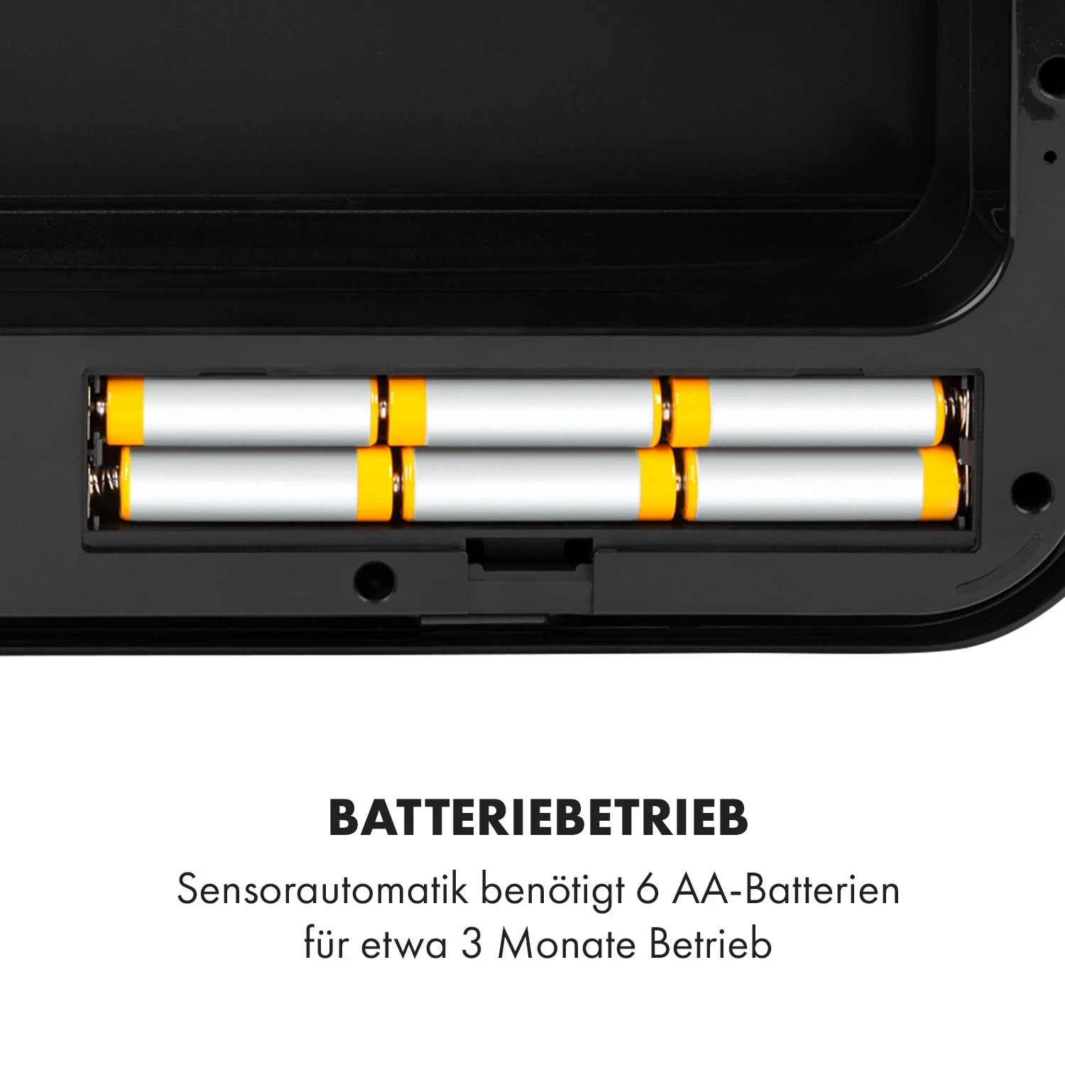 Mit seinem voluminösen Innenraum von 72 Litern bietet der Klarstein Royal Trash einen großen Müllbeutelbehälter von 43 Litern sowie 2 x 12,5 Liter große Recycling-Behälter. So können zum Beispiel sperriger Recycling-Abfall, Restmüll und Papier direkt beim Einwerfen getrennt werden. Besonders praktisch ist der eingehängte 4 Liter Eimer, in dem Bio-Abfälle entsorgt werden können und der dank Deckel mit einem zusätzlichen Geruchsschutz versehen sind. Das Befüllen des oberen Müllbehälters ist völlig berührungslos möglich: Dank Deckelsensor öffnet dieser sich vollautomatisch, sobald man in den Sensorbereich von etwa 20 cm Abstand kommt. 5 Sekunden, nachdem der Müll eingeworfen wurde, schließt sich der Deckel wieder automatisch. Bei Bedarf kann der Deckel auch per Knopfdruck geöffnet und wieder geschlossen werden. Die 2 x 12,5 Liter großen Recycling-Behälter befinden sich in einer rollengelagerten Schublade und gleiten per Handgriff vor und zurück. Auch optisch weiß der Royal Trash Matte Black zu überzeugen, sein glatter Edelstahl-Korpus ist nicht nur elegant, sondern auch unempfindlich gegenüber Fingerabdrücken. Kontrollleuchten am Bedienpanel informieren außerdem zuverlässig über Sensorstatus und Füllstand der eingelegten Batterien, während der SoftClose Lid-Mechanismus für ein besonders leises Öffnen und Schließen sorgt. Der Restmüll-Behälter des Klarstein Sensor-Mülleimers ist darüber hinaus mit einem aufgesteckten Klemmring ausgestattet, der einen festen Halt des Müllbeutels gewährleistet.