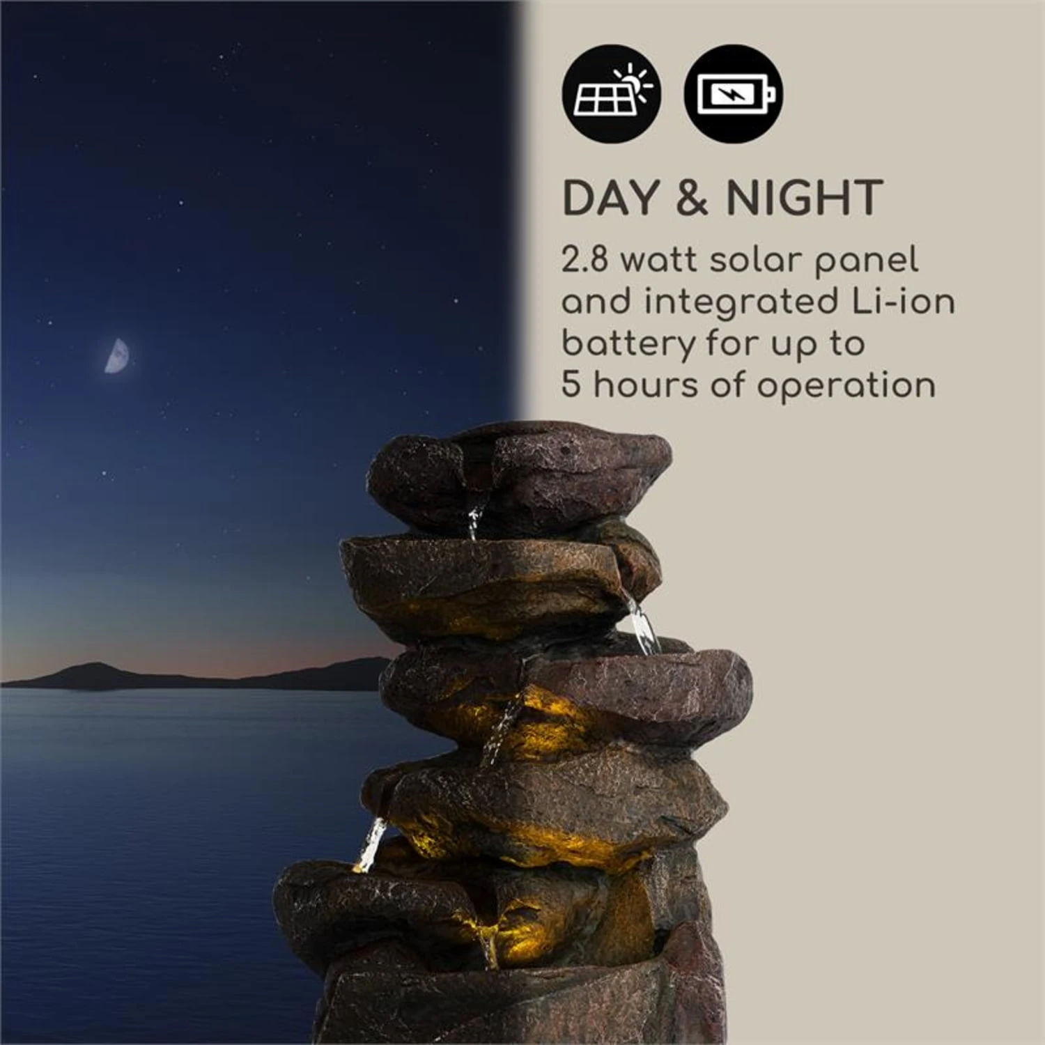 Mit dem Blumfeldt Savona Solarbrunnen werden durch die Kombination aus sanft fließendem Wasser, stimmungsvoller Beleuchtung und formschöner Steinoptik Garten, Balkon und Wohnzimmer zu einer Oase der Entspannung.