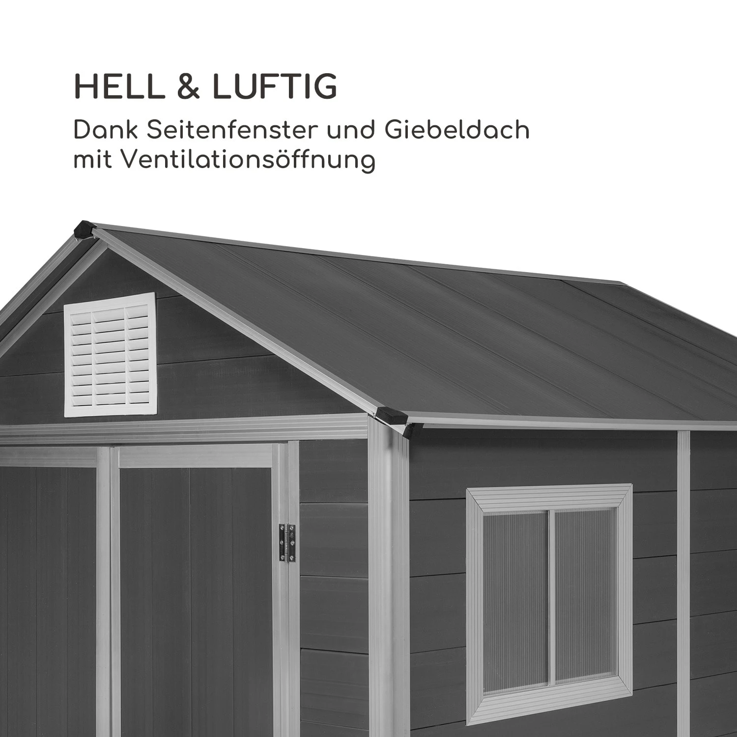 Die blumfeldt Schatzkammer sorgt nach getaner Gartenarbeit zuverlässig für Ordnung und bietet idealen Schutz für Werkzeug, Gartengeräte und Gartenmöbel vor Sonneneinstrahlung, Rost- und Schimmelbildung. Das schmucke Häuschen aus resistentem PVC verfügt mit seinen Maßen von 170 x 218 x 170 cm nämlich nicht nur über jede Menge Stauraum, sondern bewahrt sämtliche Geräte und Möbel dank Witterungs- und UV-Schutz auch ganzjährig vor Wind und Wetter. Eine Ventilationsöffnung sorgt zusätzlich für eine kontinuierliche Belüftung, während das Seitenfenster den Innenraum mit ausreichend Licht versorgt. Eine verriegelbare Doppeltür hält außerdem alle unliebsamen Besucher vom Eintritt in den Geräteschuppen ab. Für noch mehr Sicherheit kann zusätzlich ein Vorhängeschloss angebracht werden. Mit ihrem stilvollen Äußeren fügt sich die Schatzkammer darüber hinaus perfekt in jedes Gartenambiente ein.