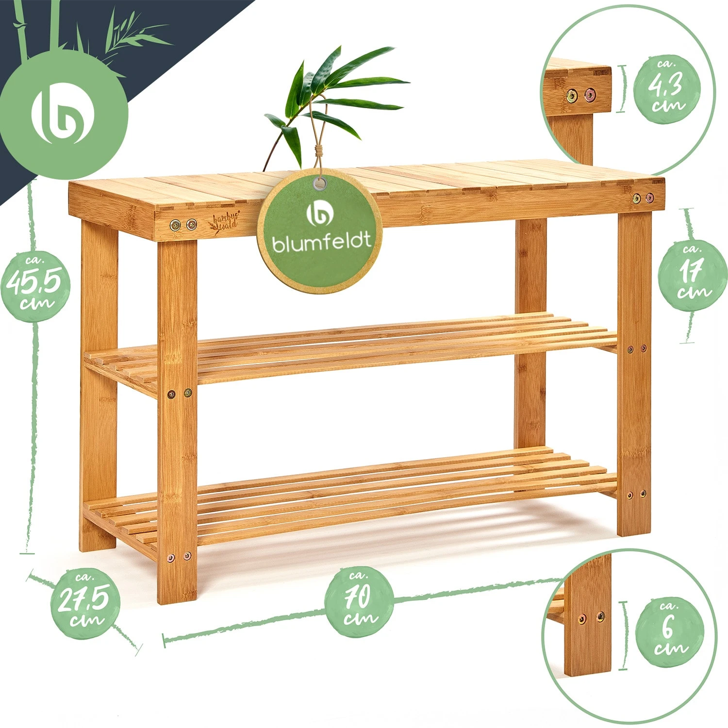 Verpasse deinem Eingangsbereich einen Hauch von Natur. Unsere blumfeldt Schuhbank aus Bambus ist ein natürlicher Blickfang in Flur, Diele, Treppenhaus oder Vorzimmer. Auf zwei Etagen bietet das Schuhregal Platz für deine liebsten Sneaker, Sandalen, Pumps und Slipper. Der Platz reicht locker für bis zu 8 Paar Schuhe. Der Zwischenraum zwischen den Etagen beträgt 17 cm.